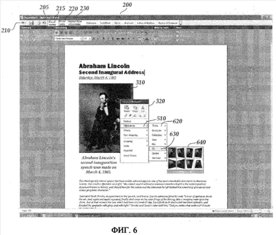 На фиг. 5 дополнительное меню выбираемых элементов управления функциональными возможностями показывается рядом с контекстным меню 320 в ответ на выбор функционального элемента управления из контекстного меню 320. Как должно быть понятно специалистам в данной области техники, всплывающее меню 520 содержит дополнительные выбираемые элементы управления функциональными возможностями, которые могут быть выбраны пользователем для применения идентифицированных функциональных возможностей к выбранному документу или объекту. Как показано на фиг.6, после выбора заданного элемента управления функциональными возможностями из всплывающего меню 520, к примеру элемента управления 3D , дополнительное всплывающее меню 640 предоставляется для отображения дополнительных функциональных возможностей, связанных с выбранным элементом управления из всплывающего меню 520. Как показано на фиг.6, выбор элемента управления 3D 630 вызывает всплывающую галерею изображений 640 на экран. Как описано выше со ссылкой на фиг. 4, каждое изображение из галереи изображений 640 показывает, как выбранный объект изображение будет выглядеть, если применить комбинацию форматирующих опций, связанную с выбранным изображением из галереи изображений 640, к выбранному объекту 310.