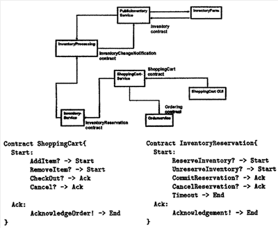 для X (L. Для ((p(L) P=(a+b.c)#(c+b.a) Q=(a+b.a)#(c+b.c) Это может быть проверено из определений (или см. подробности в [?]) того, что P (Q, но P 4. Применение На основании теории, представленной в разделе 3, мы реализовали средство проверки соответствия, которое может быть использовано для анализа асинхронных программ, написанных на общеизвестных языках программирования. Такие языки (например, С, Java, C#) имеют некоторые возможности (такие как вызовы процедур, указатели, разделяемая память, исключения и объекты), которые громоздки для непосредственного моделирования в CCS (Calculus of Communicating Systems – исчисление общающихся процессов). Наше средство проверки соответствия считает приемлемым язык ZING, который поддерживает такие возможности непосредственно, без необходимости в трудных для понимания средствах кодирования. Рабочая семантика ZING задана в качестве системы помеченных переходов. Все операторы, кроме операторов send и receive (отправки и приема) смоделированы в качестве переходов, помеченных Мы применили наше средство проверки соответствия, чтобы проверить контракты распределенных программ, написанных на общеизвестных языках программирования. Мы затем опишем, как были сделаны проверки соответствия, и ошибки, которые мы находили. Наше иллюстративное приложение является распределенной программой для управления инвентаризацией и упорядочивания процессов для регистрации хранения. Эта система была написана группой разработки продукта в Майкрософт в расширении к общеизвестному языку программирования, который предоставляет возможность передачи сообщений и спецификаций контракта. Контракты заданы в качестве обменивающихся данными конечных автоматов и имеют вид в исходном коде как спецификации типа. Контракты изначально были предназначены для поддержки проверки рабочего цикла поведения сообщения (чтобы отфильтровывать нежелательные последовательности сообщений и чтобы отыскивать ошибки программирования), но мы решили попытаться проверить их статически, используя ZING-средство проверки соответствия. Мы интегрировали ZING-средство проверки соответствия в среду разработки, с тем чтобы контракты могли быть автоматически проверены на беступиковое соответствие в отношении кода реализации. Мы подчеркиваем, что язык программирования, система и контракты все были написаны независимо от нас и от нашей технологии. Фиг.1. Структура системы регистрации хранения (верхняя часть) и два контракта (нижняя часть) Структура системы регистрации хранения показана на фиг.1 (верхняя часть). Она содержит в себе пять компонентов служб, Shopping Cart service (служба покупательской корзины), InventoryService (служба инвентаризации), OrderService (служба заявок), PublicInventoryService (служба открытой инвентаризации) и InventoryProcessing (инвентаризационная обработка), и, в дополнение, два процесса интерфейса пользователя. Стрелки от службы A и к службе B имеют место, если A использует (является клиентом) B. Каждая из пяти служб имеет ассоциативно связанный контракт, который является спецификацией открытого видимого поведение службы. На фиг.1 (верхняя часть) каждый контракт поименован по ассоциации со службой, которую он определяет. Два из контрактов показаны на фиг.1 (нижняя часть). Контракт задает обменивающийся данными конечный автомат через набор типов сообщений, безотносительно к полезным данным сообщения (сами типы