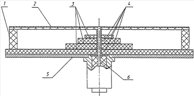 На чертеже изображена конструкция антенны, где 1 – диэлектрический корпус, 2 – логопериодическая структура, 3 – металлические прокладки, 4 – радиопоглощающие диски, 5 – металлический рефлектор, 6 – согласующий симметрирующий трансформатор.