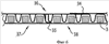 Это расположение можно получить при помощи способа изготовления, описанного со ссылками на фиг.11. Первое полотно из мягкого материала, пропитанного адгезивом, покрытое временным защитным листом 14 и намотанное на подающую катушку 15, расстилают на горизонтальной плоской площадке 16 и перемещают горизонтально за счет натяжения от принимающей катушки 17. На входе площадки лист 14 намотан на другую катушку 18. Зона 19 подачи блоков находится над передним концом площадки 16. Эта зона подачи содержит несколько полос из губки, которые расположены в линию в параллельных желобах и которые разрезают на блоки при помощи резака 23.