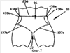 Для формирования непрямоугольной формы подгузника можно применить любой из общеизвестных путей. Например, можно удалить из подгузника дистальные в поперечном направлении части, чтобы сделать его поперечный размер на поперечной оси 44 или рядом с ней меньше, чем его поперечное направление на переднем поясном крае 436 или рядом с ним, и меньше, чем его поперечное направление на заднем поясном крае 438 или рядом с ним, т.е. сделать подгузник более узким в промежностной области 37, чем на поясных краях. Примерная форма такой непрямоугольной конфигурации подгузника показана на фиг.21. Как показано на этом чертеже, части барьерных краевых полосок 400 могут быть удалены для образования противолежащих в поперечном направлении боковых выемок 111а и 111b.
