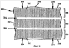 Дополнительную растяжимость в барьерных краевых полосках и (или) поглощающем комплекте можно обеспечить различными путями. Например, материал или материалы, из которых сделаны барьерные краевые полоски и (или) поглощающий комплект, могут быть гофрированы любым из множества известных способов. Альтернативно, все или часть барьерных краевых полосок и (или) весь или часть поглощающего комплекта могут быть сделаны из отформованного ребристого материала или отформованного слоистого материала из ребристых материалов, подобных описанному в патенте США 5.518.801, выданному 21 мая 1996 года на имя Chappell et al. Примерный фрагмент 300 такого отформованного ребристого материала 305 показан на фиг.9. Этот отформованный ребристый материал 305 включает в себя отличающиеся проходящие в поперечном направлении области 310, в которых исходный материал изменен тиснением или другим способом деформации для создания узора в общем ориентированных в продольном направлении гребней 312 и впадин 314. Отформованный ребристый материал 305 также включает в себя проходящие в поперечном направлении неизмененные области 316, расположенные между проходящими в поперечном направлении измененными областями 310.