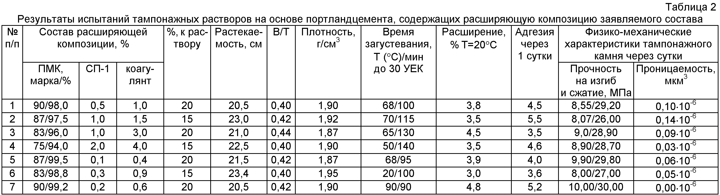 Суперпластификатор «Полипласт СП-1» представляет собой смесь натриевых солей полиметиленнафталинсульфокислот различной молекулярной массы и изготавливается в виде порошка по ТУ 5870-005-58042865-05. Коагулянт для очистки воды «Аква-Аурат» изготавливается по ТУ 6-09-05-1456-96 и представляет собой солевую композицию солей алюминия (полиалюминий гидроксид хлорид, алюминий гидрооксихлорид). Технический результат, достигаемый заявляемой композицией, – увеличение величины расширения цементного камня нормальной плотности и его адгезии, снижение проницаемости тампонажного камня, твердевшего при нормальных и умеренных температурах. Он достигается в результате синергетического эффекта взаимодействия трех компонентов композиции, обеспечивающего повышение ее активности и ранней гидратации окиси магния в составе порошка магнезитового каустического с образованием гидроксида магния, вызывающего расширение тампонажного материала. Процесс интенсивной гидратации окиси магния совпадает по времени с периодом пластического состояния формирующейся структуры и не вызывает внутреннего напряжения в ней, что обеспечено взаимодействием с суперпластификатором. Это способствует большему расширению, повышению адгезии и снижению проницаемости тампонажного камня, повышенной его деформативности. Таким образом, чтобы создать необходимые контактные напряжения без ухудшения свойств цементного камня, максимальное расширение получено в ранние сроки твердения, а затем, по мере роста модуля упругости, скорость и величина расширения должны уменьшаться таким образом, чтобы возникающие внутренние напряжения оставались бы меньше, чем прочность разрыва структурных связей цементного камня. В данном случае скорость структурообразования матрицы расширяющихся материалов больше, чем скорость кристаллизации расширения. Основным же техническим результатом, достигаемым заявляемым изобретением, является повышение качества цементирования скважины с достижением показателя АКЦ, равного единице. Для приготовления заявляемой композиции ее компоненты смешивали в смесительном агрегате. Показатели расширяющей композиции проверяли по ГОСтам на тампонажные растворы. Пример 1 Приготовили расширяющую композицию путем смешивания 94 г (94 мас.%) ПМК 75, 2,0 г (2,0 мас.%) суперпластификатора «Полипласт СП-1» и 4,0 г (4,0 мас.%) коагулянта «Аква-Аурат». Готовый состав расширяющей композиции в количестве 15 г (15% массы раствора) смешивали с 85 г (85% массы раствора) тампонажного портландцемента и затворяли 40 мл воды. Приготовленный раствор испытывали согласно существующим методикам. Показатели приведены в таблице 2, опыт 4. Пример 2 Приготовили расширяющую композицию путем смешивания 99,5 г (99,5 мас.%) ПМК 90, 0,1 г (0,1 мас.%) суперпластификатора «Полипласт СП-1» и 0,4 г (0,4 мас.%) коагулянта «Аква-Аурат». Готовый состав расширяющей композиции в количестве 20 г (20% массы раствора) смешивали с 80 г (80% массы раствора) тампонажного портландцемента и затворяли 42 мл воды. Приготовленный раствор испытывали согласно существующим методикам. Показатели приведены в таблице 2, опыт 5. Из таблицы 2, в которой приведены результаты испытаний тампонажных растворов с расширяющей композицией, содержащей различные заявляемые соотношения компонентов, видно, что проницаемость образуемого цементного камня практиче