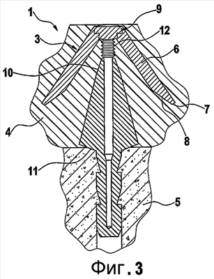 Предложенное согласно изобретению крепежное устройство 1 для изоляционного материала, изображенное на фиг.1-4, служит для закрепления пластины 4 изоляционного материала на несущем основании 5, в частности стене или потолке здесь не показанного здания. Крепежное устройство 1 для изоляционного материала предусмотрено для заглубления в пластине 4 изоляционного материала. Представленное на фиг.1 и 2 крепежное устройство 1 для изоляционного материала имеет проходящий через пластину 4 изоляционного материала цилиндрический крепежный стержень 2 и примыкающую к нему крепежную шляпку 3. Своим концом, противоположным крепежной шляпке 3, крепежный стержень 2 входит в корпус 13 дюбеля 14. Дюбель 14 закрепляется в основании 5. Крепежная шляпка 3 образуется опорными элементами 6, которые соединены с возможностью поворота с задним концом крепежного стержня 2. Опорные элементы 6 крепежной шляпки 3 могут отклоняться из монтажного положения (изображено на фиг.1) в положение удержания (изображено на фиг.2). В монтажном положении опорные элементы 6 обращены в направлении основания 5 и расположены параллельно продольной оси крепежного стержня 2. Передний конец опорного элемента 6 выполнен в виде резца 7. Резец 7 врезается при внедрении крепежной шляпки 3 в пластину 4 изоляционного материала. При заглублении крепежной шляпки 3 в пластину 4 изоляционного материала опорные элементы 6 внедряются в углубление в пластине изоляционного материала, при этом создается соединение с геометрическим замыканием с пластиной 4 изоляционного материала. Отклонение опорных элементов 6 из монтажного положения в положение удержания осуществляется с помощью принудительного распора с помощью распорных элементов 8, расположенных на опорных элементах 6. Распорные элементы 8 образуются с помощью наклоненных наружу опорных поверхностей 15 крепежной шляпки 3. Опорные поверхности 15 в начале процесса отклонения скользят по поверхностям 10 скольжения дюбеля 14 и опираются при дальнейшем отклонении на непоказанную поверхность разреза в пластине 4 изоляционного материала. Для точного позиционирования крепежного устройства 1 для изоляционного материала прилегает поясок 16 крепежного стержня 2 к торцевой поверхности дюбеля 14, обращенной к заднему концу крепежного устройства 1 для изоляционного материала, при этом дюбель 14 контропорой 11 опирается на основание 5. При внедрении крепежного устройства 1 для изоляционного материала в пластину 4 изоляционного материала на опорных элементах 6 крепежной шляпки 3 возникает момент, направленный наружу, он отклоняет опорные элементы 6 из монтажного положения в положение удержания. В положении удержания опорные элементы 6 находятся по бокам на расстоянии от крепежного стержня 2 и фиксируют пластину 4 изоляционного материала на основании 5. Положение удержания крепежной шляпки 3 определяется с помощью предохранительных элементов в форме упоров 9 на заднем конце крепежного стержня 2. Опорные элементы 6 крепежной шляпки 3 могут отклоняться до тех пор, пока опорные элементы 6 не войдут в контакт с упорами 9 крепежного устройства 1 для изоляционного материала. Упоры 9 препятствуют отклонению крепежной шляпки 3 за положение удержания.