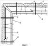 Облицовочная (внешняя) панель 3 укладывается по уроню на раствор и по высоте не более чем устанавливается передвижная панель 4, по всему периметру здания. Передвижная панель нарезается по высоте на 2 см больше, чем высота неснимаемой облицовочной панели. Если эксплуатация здания в зимних условиях предусматривает прогрев бетонных стен, то на облицовочную панель 3 изнутри через арматуру 1 навешивается утеплитель 5, который в дальнейшем прижимается бетоном. Если предусмотрено изнутри строительство тонких стенок из дерева (дерево может составить окончательный внутренний отделочный материал), пенобетонных или гипсолитовых блоков (5-10 см), гипсокартон, гипсоволокно и т.п., то утеплитель целесообразно использовать изнутри после изготовления монолитных стен между бетоном и тонкой стенкой после противогрибковой обработки по двум причинам: 1) бетон, заливаемый вплотную к облицовочной панели, лучше скрепляет облицовку, обеспечивая более долгую ее эксплуатацию, и в целом наружные стены получаются плотнее; 2) дом будет более экономичен по теплу, а теплоемкости тонких внутренних стенок, перегородок и содержащихся в помещениях предметов достаточно для удержания тепла при проветриваниях. Затем на выступающие края облицовочной арматуры 1 укладывается горизонтальная арматура 2 стен с загибанием концов для их сцепления с целью противодействия нагрузкам на разрыв и более стабильного поведения бетона при температурных перепадах, так как у бетона и железа коэффициенты расширения все же разные (лучше, чем нахлест концов арматуры). В углах арматуру желательно пропускать с изгибом, без разрыва, как показано на фиг.1. Гнуть арматуру удобно двумя железными (водопроводными на полдюйма) трубками длиной 30-50 см с продольными прорезями для вложения арматуры. После арматуры 2 устанавливаются передвижные панели 4. Первый ряд – на захватку, вместо которой можно использовать гвозди, вставляемые в просверленные в перекрытии отверстия с целью упора от распирания бетоном низа передвижной панели 4.