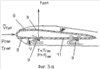 На фиг.3-а показано поперечное сечение полой рабочей лопатки с проницаемыми вставками на вогнутой поверхности для выдува низкотемпературного газа, где Vг – вектор скорости основного газового потока на входе в межлопаточное пространство, Pг – давление основного газового потока на входе в межлопаточное пространство,