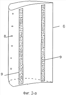 На фиг.2-а показана рабочая лопатка установки со стороны ее вогнутой поверхности, на фиг.2-б показана рабочая лопатка турбины со стороны ее выпуклой поверхности.
