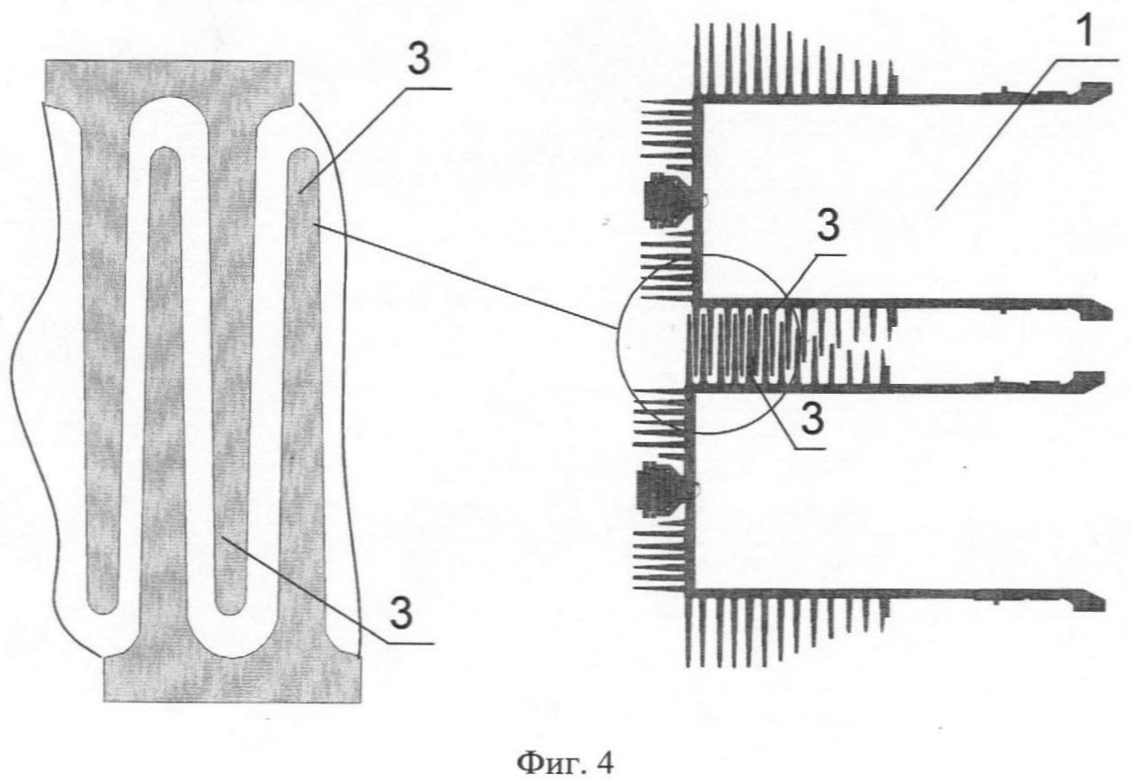 На фиг.4 схематично показано, как для турбулизации пограничного слоя обтекающего потока рабочие цилиндры 1 установлены таким образом, что наружные ребра соседних рабочих заходят друг за друга (при этом уменьшаются габариты двигателя). Турбулизация потока, вызванная противоположным вращением охлаждающих ребер 3 в местах их захода повышает коэффициент теплоотдачи от ребер 3 к обдувающему воздуху. Из-за увеличения скорости обтекания ребер 3 и соответственно увеличения коэффициента теплоотдачи длину ребер 3 можно уменьшить и рабочие цилиндры 1 могут располагаться ближе друг к другу, что уменьшит габариты двигателя.