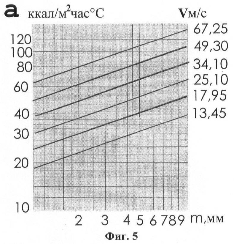 На фиг.5 графически представлены коэффициенты теплоотдачи от ребер к охлаждающему воздуху в зависимости от скорости обдува и геометрии охлаждающих ребер.