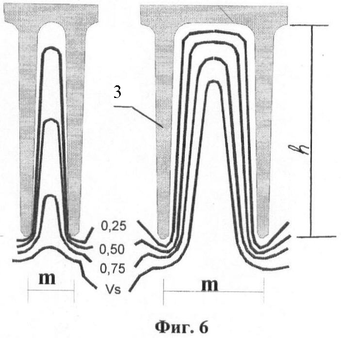 На фиг.6 показаны изолинии скорости обтекающего потока при различной ширине межреберных каналов. Как видно, увеличение площади охлаждаемой поверхности за счет высоты ребер h и уменьшения шага m эффективно до определенных пределов. Узкие и длинные каналы из-за набухания толщины пограничного слоя и увеличения гидравлического сопротивления затрудняют прохождение охладителя, и фактическая скорость обтекания снижается. Для увеличения скорости течения охладителя в межреберных каналах увеличивают давление и расход охладителя на входе в систему охлаждения, но это приводит к неоправданно высоким затратам мощности на прокачку (вентиляторные потери).