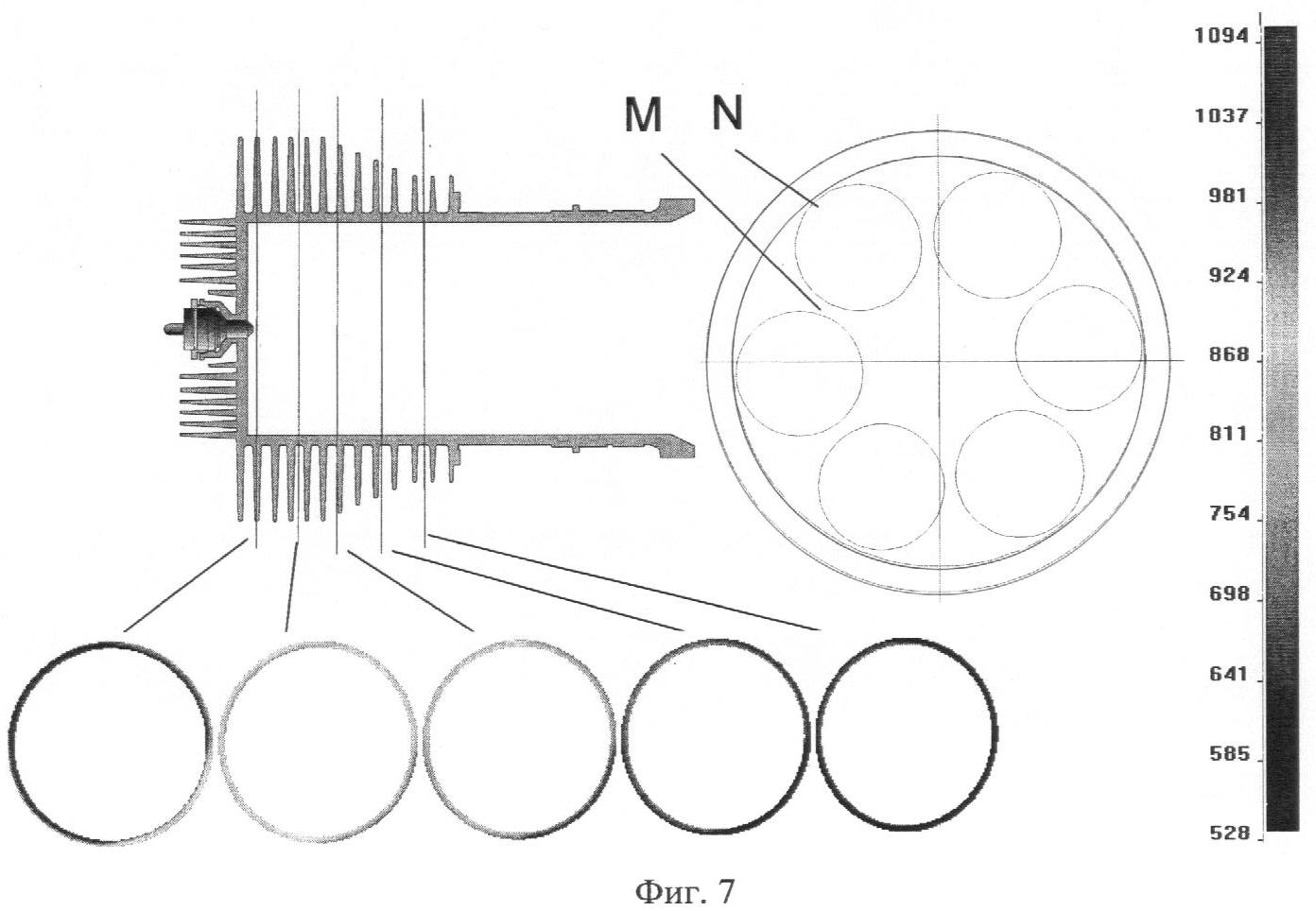 На фиг.7 представлены температурные поля поперечных сечений рабочего цилиндра по его длине при круговой схеме расположения рабочих цилиндров цилиндров. Различные участки оребрения поставлены не в равные условия (в месте М условия охлаждения хуже, чем в месте N), что приводит к неравномерному температурному полю, градиент температуры достигает более 300°С, и в случае форсирования двигателя местная температура рабочих цилиндров выходит за допустимые пределы. Неравномерное температурное поле вызывает искажение геометрической формы и неравномерный износ внутренней поверхности рабочих цилиндров.