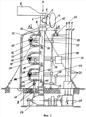 Флюгер (8), вращая основной (4) и вспомогательные ветроприемники (5 и 6), через подшипниковый узел (7) устанавливает их так, чтобы основная воздушная масса попадала в усеченные конусы корпусов ветроприемников и через полую (9) их часть направляла воздушную массу в вертикальную трубу (1), при этом, если идет дождь или снег, вся масса попадает на сетчатый сепаратор (10), который вращается электрическим приводом (11) и отбрасывает воду или снег в водоприемник (12), и она по сливной трубе (13) направляется в ливневую канализацию, а ниже сепаратора (10) установлен отсасывающий раструб (14), который с помощью первого всасывающе-нагнетательного насоса (15) создает частичное разрежение в вертикальной трубе (2), увеличивая скорость прохождения воздушного потока через трубу (2), и насос под давлением через выходной патрубок (16) и нагревательный элемент выбрасывает воздушную массу в вертикальную трубу, увеличивая ее скорость и температуру. Затем в таком же режиме работает средний насос (18) с патрубками (19 и 20) и нагревательным элементом (21), увеличивая вновь в трубе скорость, температуру и давление воздушной массы, и, наконец, вступает в работу последний насос (22) с патрубками (23, 24) и нагревательным элементом (25), который окончательно формирует воздушную массу с требуемой скоростью, температурой и давлением, потребным для турбины (26), которая через вал (27) вращает генератор (28) и тот выдает электроэнергию в электрическую сеть (29), от которой запитаны все насосы (15, 18 и 22), а также электродвигатель (11). Для первоначального пуска, когда не работает турбина (26), насосы получают электроэнергию от аккумулятора (34) через раздаточные коробки (35, 36, 37) и адаптеры (30, 31, 32), с пуском турбины адаптеры отключают аккумулятор (34), и вся система начинает работать от сети (29), в том числе и датчики (40) температуры и давления, подключенные через раздаточную коробку (38) и адаптер (39), а аккумулятор заряжается от сети (29) на случай очередного пуска ветроэнергетической установки.