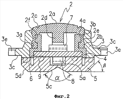 Заглушка 5 световода также снабжена крючками 5b (см. Фиг.1), установленными по четырем углам в верхней части и светоотражающей части. Светоотражающая часть включает коническую вогнутую часть 5с, установленную в центральной части нижней поверхности заглушки 5 световода, обращенной к вогнутой части 5а, и наклонную поверхность 5d, сформированную на внешней периферии заглушки 5 световода (см. Фиг.2). Заглушка 5 световода прочно соединена с каркасом 3 световода защелкивающимися крючками 5b в вырезах 3d каркаса 3 световода. В то же время поверхность клавиши 2 прочно удерживается между каркасом 3 световода и блокирующим каркасом 4 как описано выше, а подложка 6 также удерживается между заглушкой 5 световода и блокирующим каркасом 4.