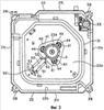 Если рассматривать случай для одного посадочного места 30 из двух посадочных мест 30, приводной вал 34а шагового двигателя 34 (см. Фиг.12) установлен таким образом, что он обращен в нижнюю часть чертежа на Фиг.11 и этот шаговый двигатель 34 поворачивает заслонку 122 (на Фиг.11 обозначенную ссылочным номером 122L), установленную вдоль левой стороны лицевой панели 100.
