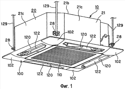 Лицевая панель 100 имеет порт 110 всасывания воздуха, предназначенный для забора внутреннего воздуха в центральную часть лицевой панели, четыре порта 120 нагнетания воздуха, которые имеют вытянутую форму, расположены вдоль боковых сторон лицевой панели 100 вокруг порта 110 всасывания воздуха и нагнетают воздух, подвергнутый теплообмену, и угловые панели 102, образующие четыре угловых области лицевой панели 100. Каждый из портов 120 нагнетания воздуха снабжен заслонкой 122, предназначенной для регулирования направления нагнетания воздуха. Угловые панели 102 выполнены такой конструкции, которая позволяет устанавливать их с возможностью снятия с нижней стороны лицевой панели 100, и такого размера, чтобы рабочий-установщик мог рукой дотянуться до области установки кронштейнов 28 для подвешивания на болтах 129 для подвешивания, когда угловая панель 102 снята.