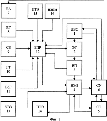 Движение. При движении объекта питание силовой электромашины 5 осуществляется от накопителя электрической энергии 4 по сигналам системы управления 6 через блок преобразования и регулирования 12, а потребителей электрической энергии 14 – непосредственно. Механическая энергия, вырабатываемая двигателем внутреннего сгорания 1, преобразуется в электрическую энергию электрическим генератором 2, которая через выпрямитель 3 заряжает накопитель электрической энергии 4. Одновременно через блок преобразования и регулирования 12 происходит подзарядка накопителя электрической энергии 4 от солнечной батареи 9, газовой турбинки 10, виброгенератора 11, преобразователя тепловой энергии в электрическую 15 и преобразователя энергии перемещения масс в электрическую энергию 16.