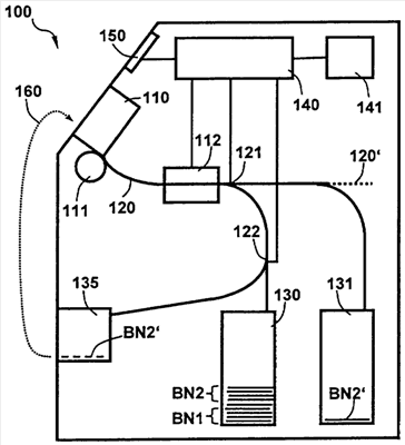 Вместе с тем, устройство 100 может также иметь дополнительный накопитель 131, соединенный стрелкой 121 с транспортирующей системой 120. Таким путем нераспознанные банкноты BN2′ можно хранить отдельно от распознанных банкнот BN1, BN2 с целью обеспечить возможность их последующей отдельной обработки.
