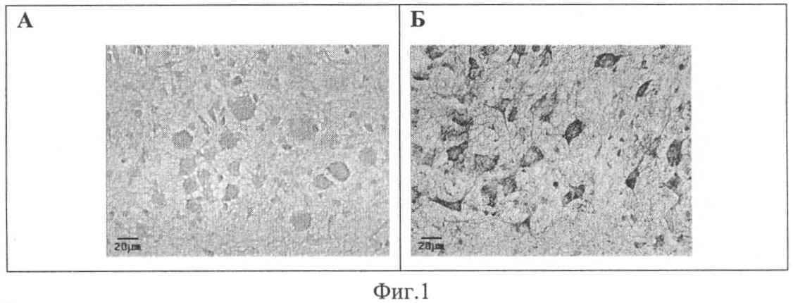 Предлагаемый способ является соединением выявленных авторами закономерностей протекания апоптоза у новорожденных лабораторных животных и известных методов выявления признаков программируемой гибели клеток. Проведенные нами ранее эксперименты показали, что естественная гибель избыточных клеток мозга путем апоптоза в раннем онтогенезе грызунов достаточно интенсивна для ее надежной детекции и в то же время чувствительна даже к очень умеренным по силе как про-, так антиапоптогенным воздействиям. Например, умеренная гипоксия, не влияющая на жизнеспособность, рост и двигательную активность новорожденных крысят, резко повышала экспрессию активной каспазы-3, выявляемой иммуногистохимически, в стволовой части головного мозга (фиг.1), что свидетельствует о проапоптозном действии используемого относительно слабого воздействия и выявляет высокую чувствительность предлагаемого способа скрининга препаратов.