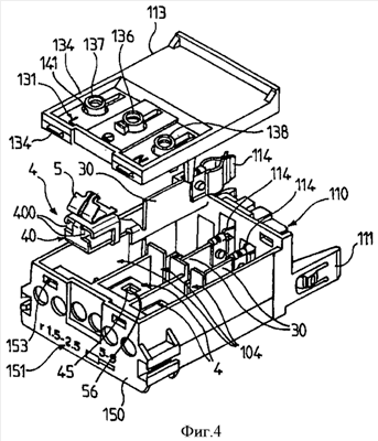Эти плунжеры 136, 137 и 138 разработаны специально, чтобы обеспечить отключение кабелей от земли, от силовой линии и от нейтрального проводника, и расположены над корпусами 104, определяемыми стенками для размещения безвинтовых соединителей 4.