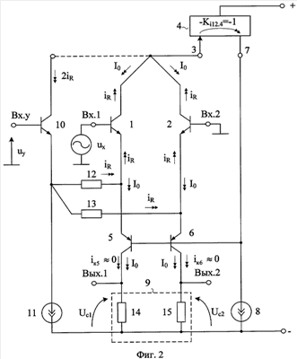 На базе заявляемого ККДУ (с учетом свойств фиг.9, фиг.10) реализуются смесители и/или перемножители сигналов. При противофазном изменении напряжения управления uy=v2, на входах ККДУ фиг.12 противофазно изменяются (в соответствии с фиг.9, фиг.10) коэффициенты усиления ККДУ. Это является одним из условий перемножения двух напряжений ux, uу (фиг.14). Диапазон перемножения по каналу «X» может быть расширен традиционным способом – применением входных логарифмирующих диодов.