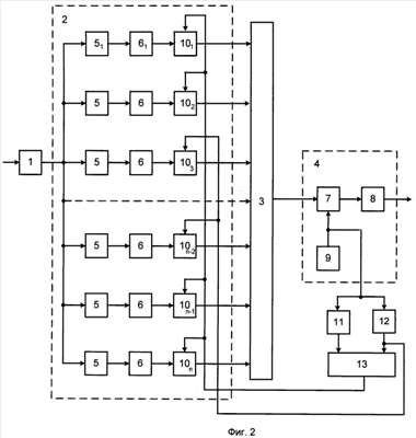 При этом ширина полос всех n парциальных каналов должна быть одинакова и, кроме того, полосы частот парциальных каналов не должны перекрываться. Поэтому амплитудно-частотная характеристика (АЧХ) и фазочастотная характеристика (ФЧХ) подавителя помех (блока защиты) 2 представляется как сумма АЧХ и ФЧХ отдельных каналов.