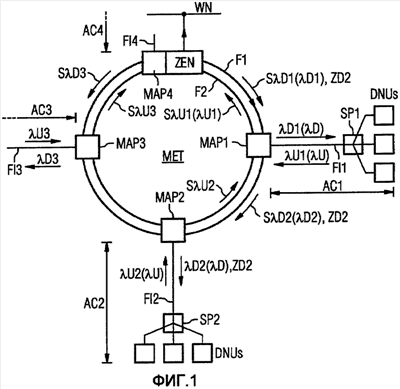 Система передачи выполнена таким образом, что соединения доступа АС1-АС4 (на фиг.1 показаны лишь частично) не содержат активных элементов. Только устройства МАР метро-подключения и сетевые терминалы ONU требуют активных элементов и, следовательно, энергии. И остальная система передачи, базовая метро-сеть, предпочтительно выполнена таким образом, что не требуются никакие усилители между устройствами МАР метро-подключения МАР и центром ZEN управления и коммутации. И здесь, естественно, возможно резервирование путем применения второй волоконной линии.