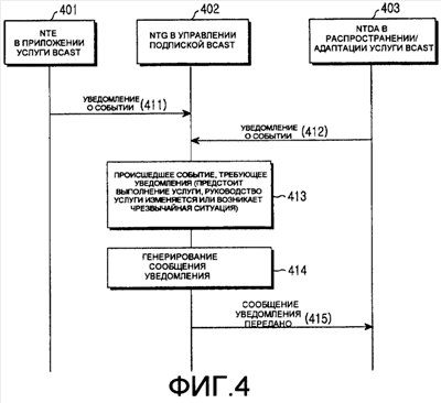 Как показано на фиг.2, блок 201 формирования содержания (CC, ФС) представляет собой провайдера услуги BCAST, и услуга BCAST может включать в себя обычную услугу широковещательной передачи аудио/видеоданных, услугу загрузки музыкальных файлов/файлов данных и так далее. Когда возникает проблема, связанная с предоставлением услуги BCAST, или происходит изменение услуги BCAST, блок 201 формирования содержания уведомляет об этом изменении функцию 202-1 события, требующего уведомления, (NTE, СДУ), которая расположена в приложении 202 услуги BCAST.