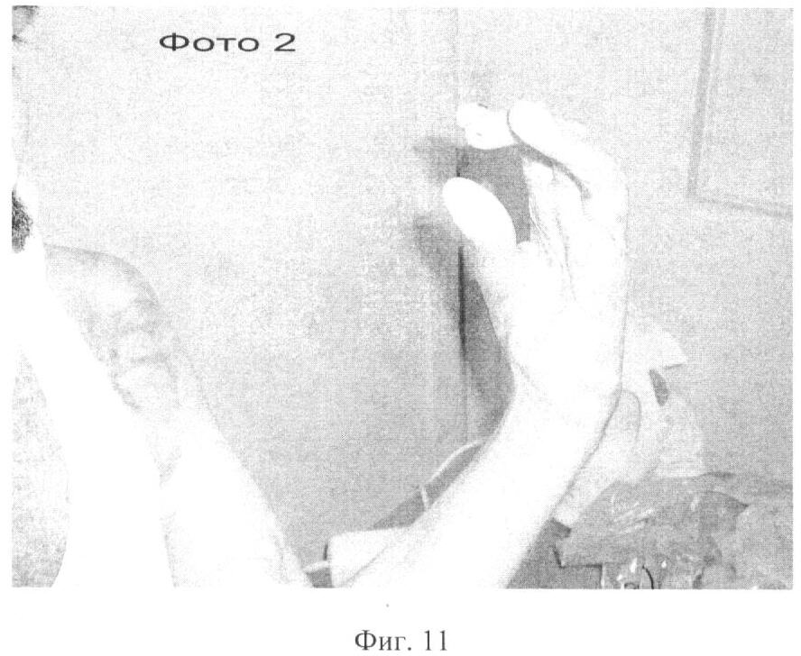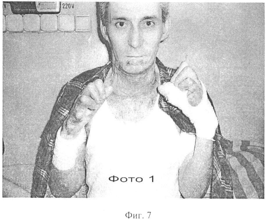 Пример 1. Пациент Б., 45 лет. Медицинская карта 314. Поступил в МУЗ ГКБ 6 в областное ожоговое отделение 26.02.2007 с диагнозом: «Послеожоговая рубцовая деформация обеих кистей рук, сгибательная контрактура пальцев кистей рук 3-4 степени по Ларину. Послеожоговые гипертрофические рубцы верхних конечностей, туловища, шеи» (Фиг.7). После подготовки, 12.03.2007 выполнена операция: «Рассечение рубцов ладонной поверхности 2-3-4 пальцев левой кисти, наложение чрескостного дистракционного аппарата внешней фиксации»: под проводниковой анестезией плечевого сплетения, после обработки операционного поля раствором антисептика, через ногтевые фаланги 2-3-4 пальцев проведены инъекционные иглы, через которые пропущены отрезки проволоки, концы которых скручены; иглы П-образно изогнуты с формированием тяг (Фиг.8). Скальпелем на ладонной поверхности 2-3-4 пальцев левой кисти выполнено рассечение гипертрофических тянущих рубцов параллельными разрезами с оставлением «мостовидных» лоскутов. Гемостаз электрокоагулятором. Через пястные кости проведены спицы Киршнера, которые закреплены и натянуты в «дугах» аппарата, смонтирован аппарат внешней фиксации (Фиг.9). Дана дистракция. В послеоперационном периоде продолжена управляемая векторная дистракция (Фиг.10). Пальцы кисти выведены в функционально выгодное положение. 26.03.2007 раны эпителизировались почти полностью, аппарат демонтирован. Больной с рекомендациями по дальнейшей реабилитации выписан на амбулаторное лечение. На контрольном осмотре через 2 месяца – результат лечения хороший: вторичной деформации нет, отмечается улучшение охвата кисти и пальцев (Фиг.11).