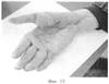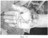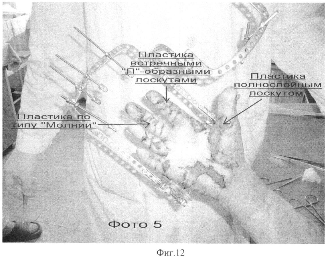 Пример 2. Пациент П., 40 лет. Медицинская карта 649. Поступил 21.12.2003 с диагнозом: «Ожоговая болезнь в стадии реконвалесценции. Послеожоговая рубцовая деформация лица и кистей рук. Контрактура пальцев кистей рук 2-4 степени по Парину. После подготовки, 22.12.2003 выполнена операция: «Рассечение и иссечение рубцов ладонной поверхности правой кисти, наложение чрескостного дистракционного аппарата внешней фиксации, комбинированная пластика ран правой кисти» (Фиг.11): под мультимодальной анестезией (проводниковая анестезия плечевого сплетения и общий наркоз), после обработки операционного поля раствором антисептика, через ногтевые фаланги 1-2-3-4-5 пальцев проведены инъекционные иглы, через которые пропущены отрезки проволоки, концы которых скручены; иглы П-образно изогнуты с формированием тяг. Скальпелем на ладонной поверхности пальцев правой кисти выполнено рассечение гипертрофических тянущих рубцов и редрессация межфаланговых и пястно-фаланговых суставов. Гемостаз электрокоагулятором. На 2-4-5 пальцах выкроены встречные П-образные, а на 3-м пальце – треугольные кожные лоскуты. Лоскуты встречно перемещены, фиксированы отдельными узловыми швами к противоположному краю раны с возможностью укрытия ран. На ладонной поверхности кисти выполнено иссечение гипертрофического рубца. Гемостаз. На передней брюшной стенке в надлобковой области скальпелем выкроен полнослойный кожный лоскут овоидной формы размером 14 на 4 см (по максимальным размерам). Донорская зона послойно ушита узловыми швами наглухо. Кожный лоскут обработан по Красовитову, уложен на образовавшиеся раны ладони, фиксирован отдельными узловыми швами. Через пястные кости проведены спицы Киршнера, которые закреплены и натянуты в «дугах» аппарата, смонтирован аппарат внешней фиксации. Дана дистракция. В послеоперационном периоде продолжена управляемая векторная дистракция. Пальцы кисти выведены в анатомическое положение. 30.12.2003 раны эпителизировались почти полностью, аппарат демонтирован. Продолжено дальнейшее комплексное лечение в условиях стационара. 28.02.2004 больной с рекомендациями по дальнейшей реабилитации выписан на амбулаторное лечение. На контрольном осмотре через 3,5 года – результат лечения хороший: вторичной деформации кисти нет, схват кисти и пальцев почти полный.