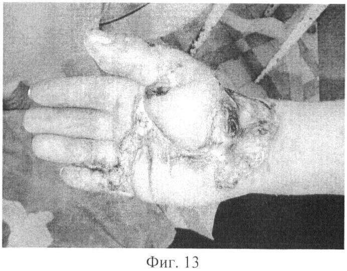 Фиг.13 – фото электротравмы кисти пациента до лечения;