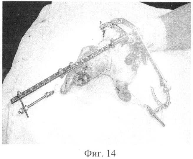 Фиг.14 – кожная пластика ран кисти с наложенным на нее чрескостным устройством для фиксации кисти;
