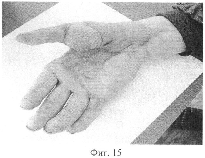 Пример 3. Пациент М., 42 года. Медицинская карта 237. Поступил 23.05.2006 с диагнозом: «Электротравма, электроожог правой кисти IIIб-IV степени 1,5% площади тела. Поражение нервов электротоком. Контрактура пальцев правой кисти» (Фиг.13). Проводилось комплексное лечение, в том числе оперативное: 30.05.2006 – операция некрэктомия мягких тканей правой кисти; 06.06.2006 – операция повторная некрэктомия ран правой кисти и 1-ый этап Итальянской пластики (формирование и перемещение кожно-жирового лоскута с передней брюшной стенки); 04.07.2006 – Операция 2-ой этап Итальянской пластики (отсечение питающей ножки кожно-жирового лоскута); 13.07.2006 – операция ревизия ран правой кисти, пластика ран свободным расщепленным кожным лоскутом, наложение дистракционного аппарата внешней фиксации (Фиг.14). После проведенного лечения раны эпителизировались, аппарат демонтирован. 01.08.2006 больной выписан на амбулаторное долечивание по месту жительства. На контрольном осмотре через 2 года – функция кисти восстановлена почти полностью: сохраняется умеренное ограничение схвата кисти и отсутствие отведения 1-го пальца (Фиг.15).