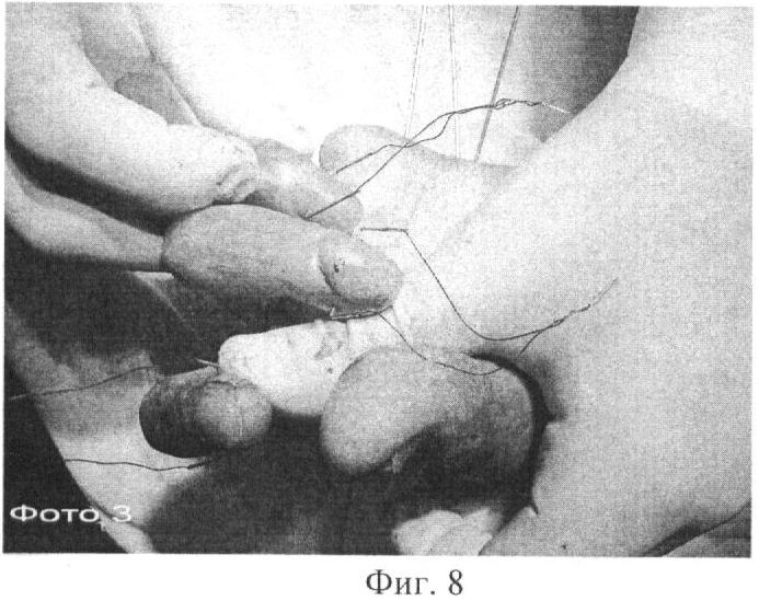 Пластику местными мостовидными лоскутами используют преимущественно на ладонной поверхности пальцев кисти. Ее выполняют после монтажа тяг на ногтевых фалангах пальцев и ручной тракции за данные тяги. Для этого производят острым путем (скальпелем) рассечение кожи, мягких тканей и рубцов кисти перпендикулярно вектору действия деформирующей силы (поперек направления тяги рубца). Разрезы производят параллельно на расстоянии 3-5 мм таким образом, чтобы сохранились параллельно расположенные мостовидные участки кожных покровов шириной 3-5 мм и длиной до 1/2 окружности пальца. Данные участки кожи служат источником размножения эпителиоцитов. Раны эпителизируются без дополнительной кожной пластики (Фиг.6).