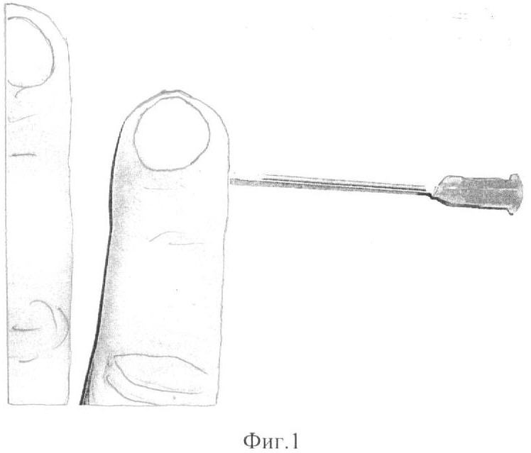 В условиях операционной проводят обработку операционного поля допустимыми антисептиками. Через ногтевые фаланги пальцев кисти трансоссально (т.е. через кость ногтевой фаланги) перпендикулярно оси пальца и параллельно ногтевой пластинке (Фиг.1) методом вращательно-поступательного движения мануально проводят гибкие трубки 14, в качестве которых могут быть использованы, например, инъекционные иглы диаметром 1,5-2,0 мм. Далее, через гибкие трубки 14 пропускают гибкие тяги 13, после чего выступающие из фаланг пальцев концы гибких трубок, вместе с размещенными в них тягами 13, П-образно изгибают в дистальном направлении на расстоянии 2,0-3,0 мм от поверхности кожи (Фиг.2). В качестве гибких тяг может быть использована металлическая проволока диаметром 0,5-0,8 мм (аналогичная проволоке в спирали Артикул 1C11-4768 ТУ 16-538.080-79). Выступающие концы проволоки соединяют путем скручивания на расстоянии, достаточном для присоединения к резьбовому дистрактору 11. Осуществляют умеренную ручную тракцию за сформированные тяги.