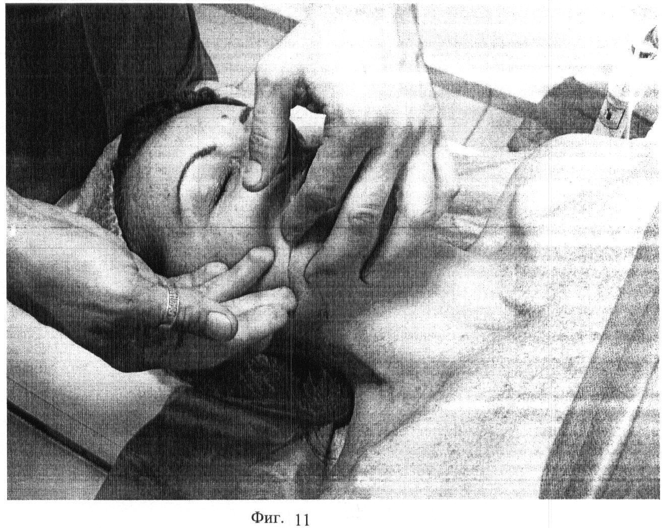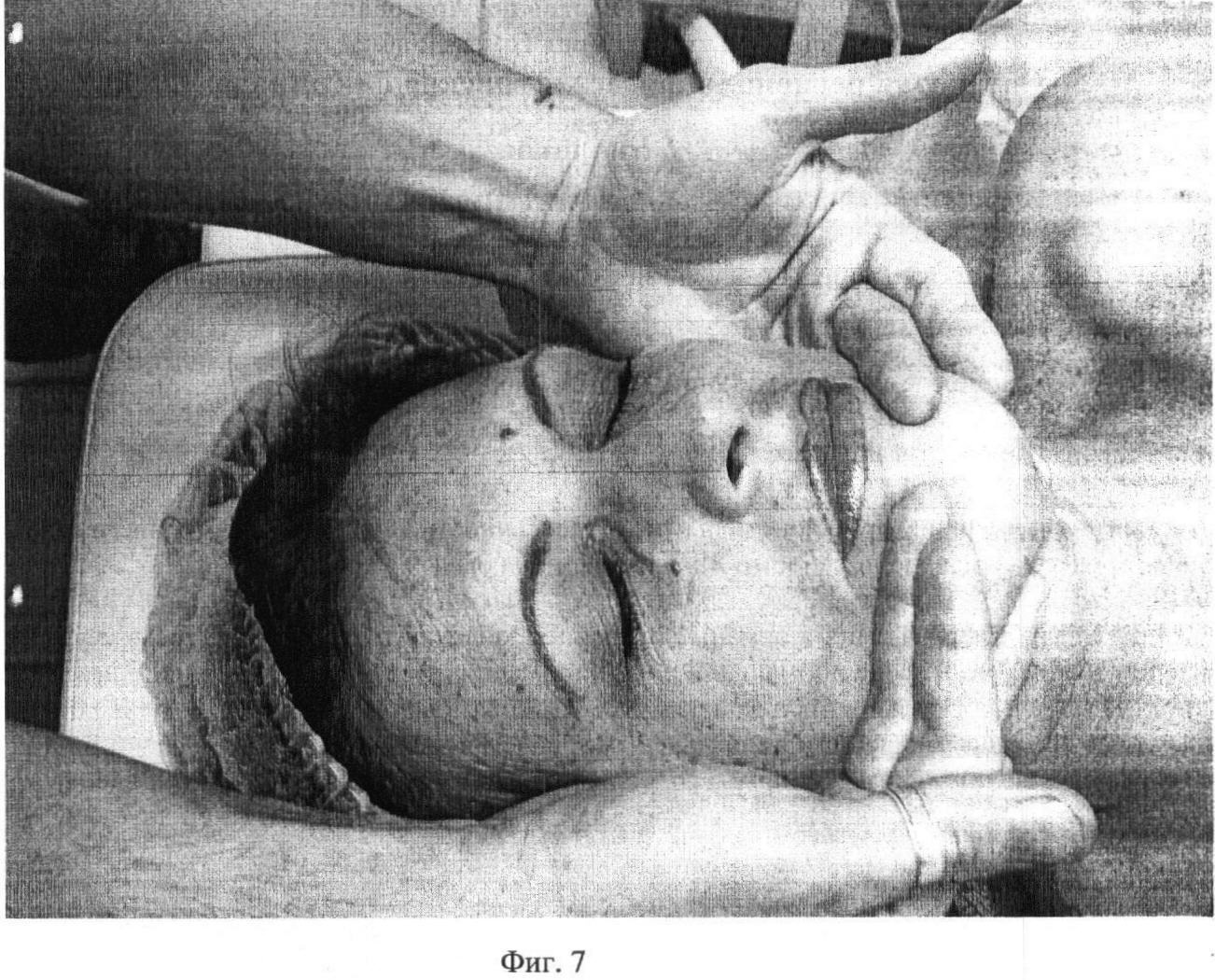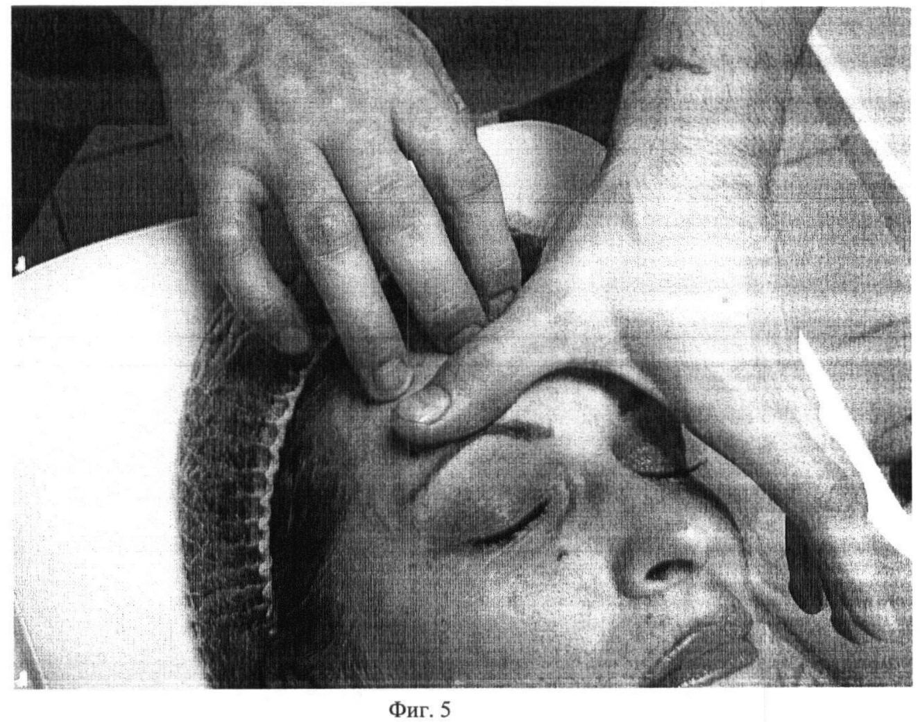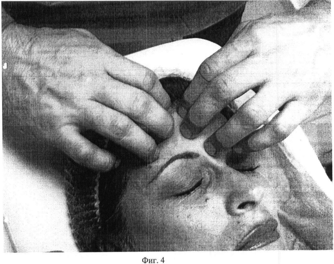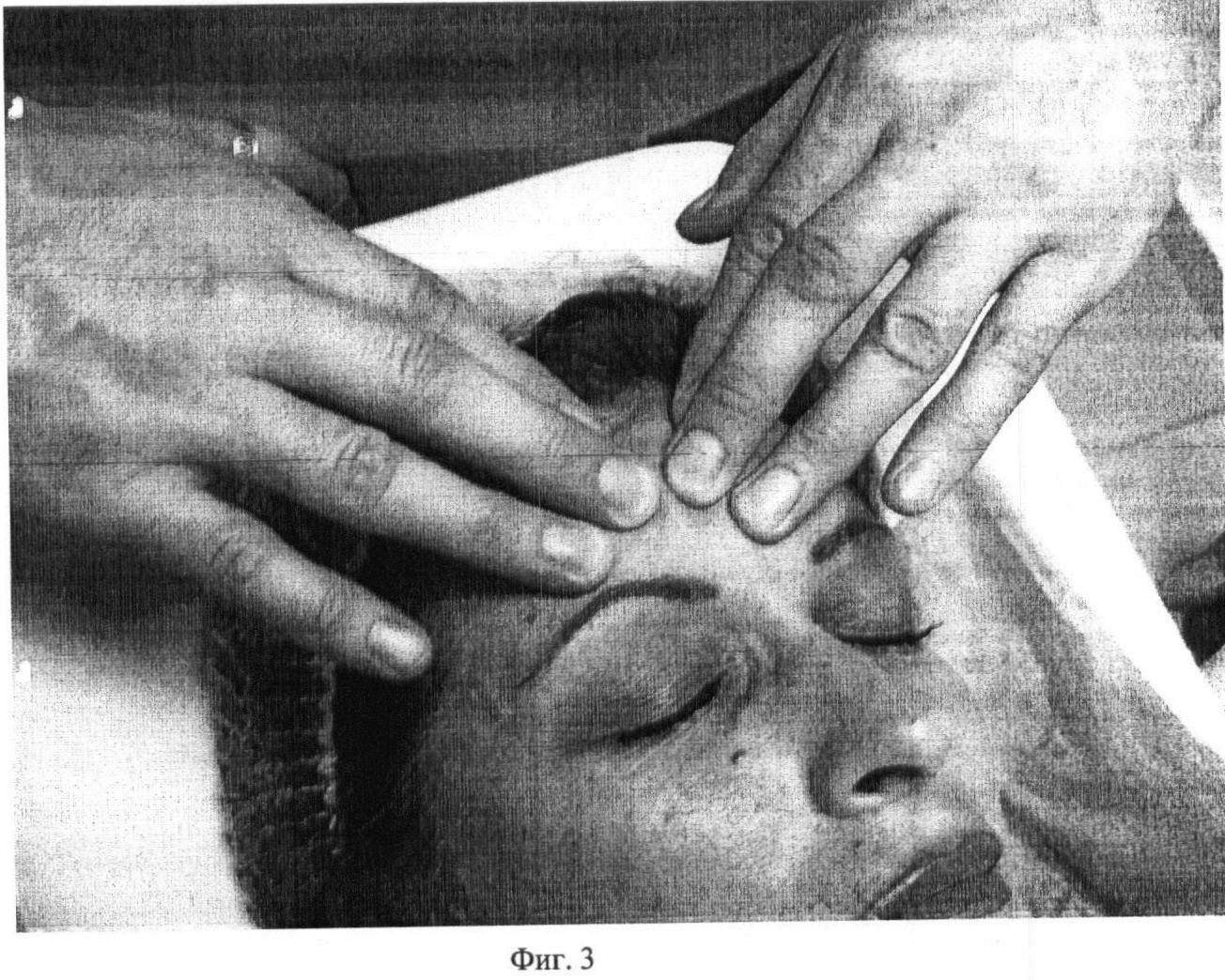 Второй этап. Фиг.2. Проводят медленное, глубокое сдвигание поверхности кожи на лобно-затылочной мышце (m. occipitofrontalis) первыми пальцами обеих рук под углом 5-10 градусов в течение 10 секунд.