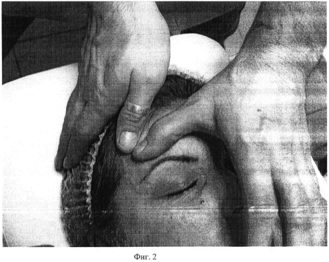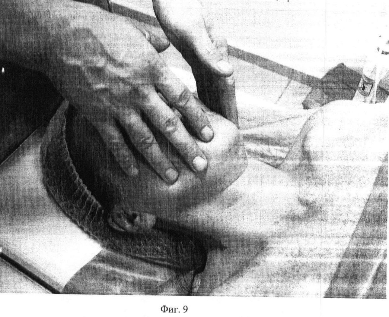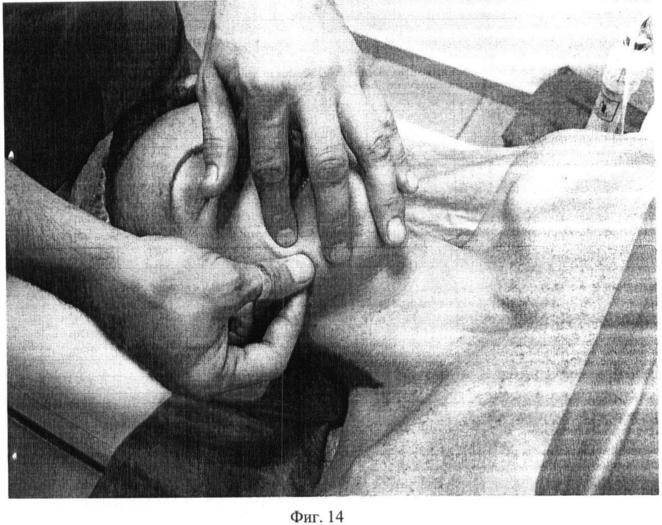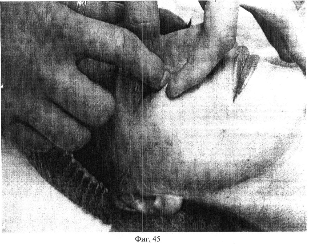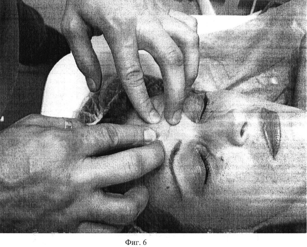 Второй этап. Фиг.2. Проводят медленное, глубокое сдвигание поверхности кожи на лобно-затылочной мышце (m. occipitofrontalis) первыми пальцами обеих рук под углом 5-10 градусов в течение 10 секунд.