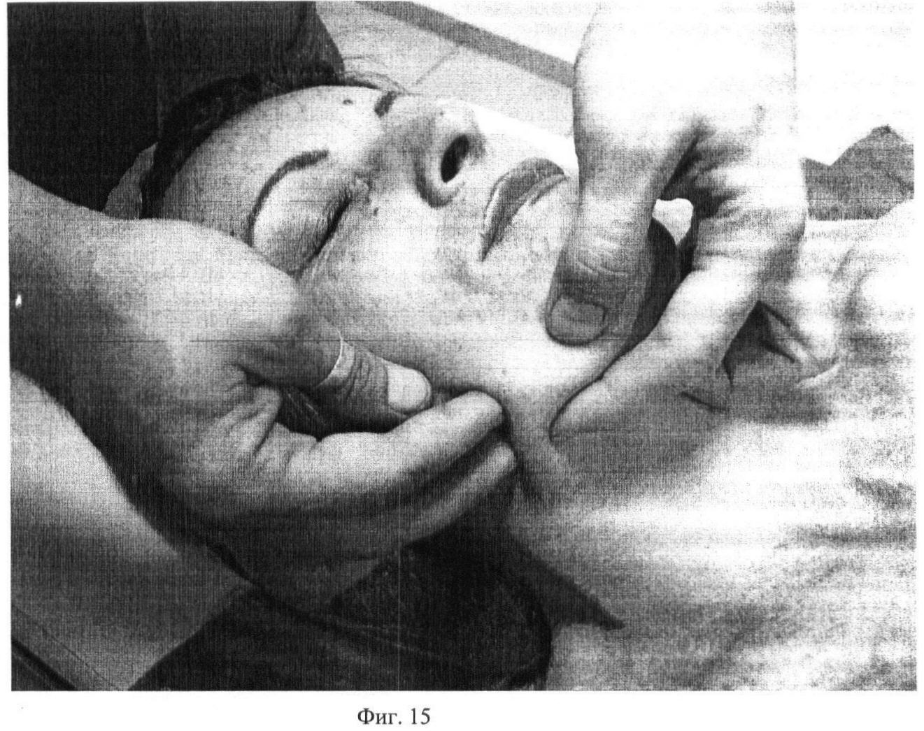 Способ нехирургического лифтинга лица путем проведения массажа, отличающийся тем, что на первом этапе начинают массаж с интенсивной стимуляции круговыми движениями первым и вторым пальцами обеих рук лобно-затылочной мышцы (m.occipitofrontalis) в течение 20 с по всей поверхности, на втором этапе проводят медленное, глубокое сдвигание поверхности кожи на лобно-затылочной мышце (m.occipitofrontalis) первыми пальцами обеих рук под углом 5-10° в течение 10 с, на третьем этапе вторым, третьим и четвертым пальцами обеих рук выполняют штрихующие продольные и поперечные движения, постоянно сгибая и разгибая пальцы во вторых фалангах, в течение 15 с, на четвертом этапе первым пальцем левой руки выполняют медленные накатывающие движения на второй, третий и четвертый пальцы правой руки в течение 10 с, на пятом этапе вторым, третьим и четвертым пальцами обеих рук, под углом 80-90° к массируемой поверхности, производят частые вращательные движения по часовой стрелке на всей поверхности лобно-затылочной мышцы (m.occipitofrontalis) в течение 20 с, на шестом этапе вторым и третьим, либо третьим и четвертым пальцами выполняют сотрясение в области подбородка, которая включает мышцу, опускающую угол рта, мышцу, опускающую нижнюю губу, и подбородочную мышцу (m.depressor anquli oris, m.depressor labii inferioris, m.mentalis) в различных направлениях в течение 10 с, на седьмой этапе вторым, третьим и четвертым пальцами обеих рук, под углом 80-90° делают медленные, вращательные движения по часовой стрелке в области подбородка, которая включает мышцу, опускающую угол рта, мышцу, опускающую нижнюю губу (m.depressor anquli oris, m.depressor labii inferioris), в течение 5-10 с, на восьмом этапе осуществляют сдвигание первыми пальцами кожно-мышечного валика навстречу друг другу в области подбородка в различных направлениях в течение 15 с, на девятом этапе, захватив между вторым и третьим пальцами валик из массируемой ткани, выполняют интенсивное сотрясение мышцы, опускающей угол рта, мышцы, опускающей нижнюю губу, подбородочной мышцы и жевательной мышцы (m.depressor anquli oris, m.depressor labii inferioris, m.mentalis и m.masseter) в течение 15 с, на десятом этапе первым и вторым пальцами производят плавное, медленное разминание на мышце, опускающей угол рта, мышце, опускающей нижнюю губу, подбородочной мышце и жевательной мышце (m.depressor anquli oris, m.depressor labii inferioris, m.mentalis и m.masseter) в различных направлениях, придерживая валик из массируемой ткани вторым и третьим пальцами другой руки, движение выполняют в течение 10 с, на одиннадцатом этапе дистальными фалангами вторых и третьих пальцев обеих рук выполняют частое поверхностное сдвигание подкожной мышцы шеи в различных направлениях, в течение 20 с по всей поверхности подкожной мышцы шеи (m.platisma), на двенадцатом этапе первым, вторым, третьим и четвертым пальцами обеих рук выполняют сдвигание кожной складки на подкожной мышце шеи (m.platisma) в различных направлениях, постоянно меняя угол наклона пальцев к массируемой поверхности, движение выполняют в течение 15 с, на тринадцатом этапе, придерживая третьим, четвертым и пятым пальцами одной руки валик из массируемой ткани, третьим и четвертым пальцами другой руки выполняют частые накатывающие движения на всей поверхности большой грудной мышцы (m.pectoralis major) в течение 15 с, на четырнадцатом этапе постепенно, меняя нагрузку на большую грудную мышцу (m.pectoralis major), вначале сильно сдвигая кожную складку перв