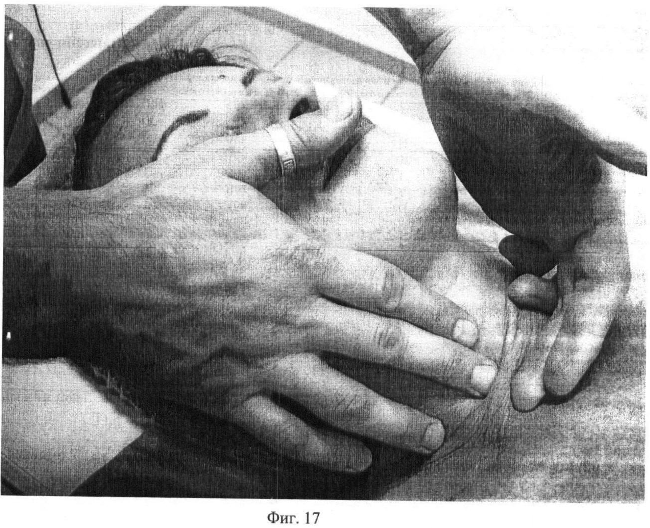 Одиннадцатый этап. Фиг.16-17. Дистальными фалангами вторых и третьих пальцев обеих рук выполняют частое поверхностное сдвигание подкожной мышцы шеи в различных направлениях, в течение 20 секунд по всей поверхности platisma.