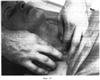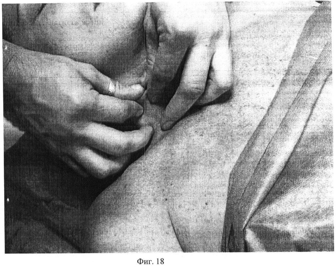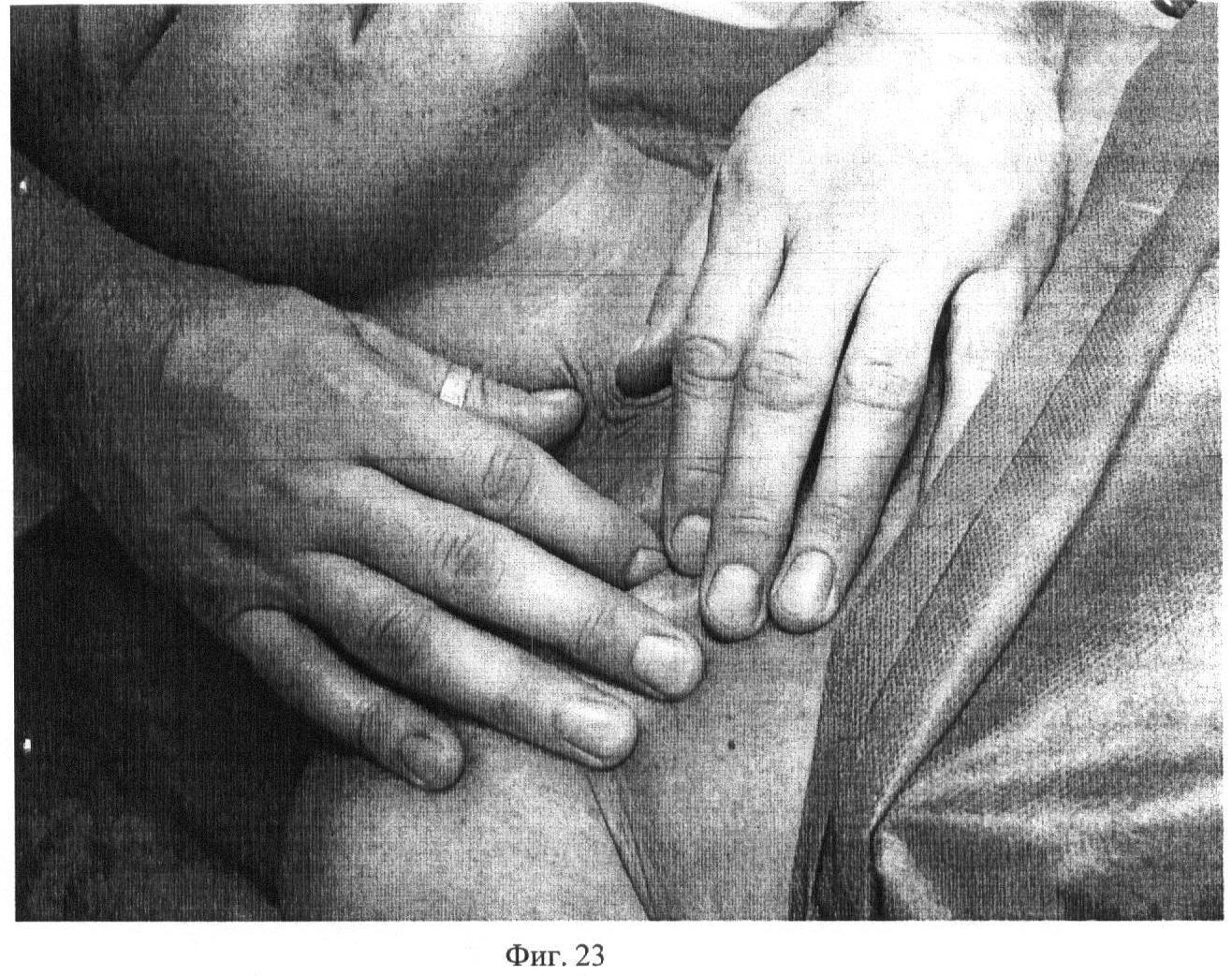 Четырнадцатый этап. Фиг.23-24-25. Постепенно, меняя нагрузку на m. pectiralis major, вначале сильно сдвигая кожную складку первыми пальцами, затем вторыми и третьими, затем четвертыми и пятыми пальцами обеих рук, выполняют глубокое разминание в течение 20 секунд.