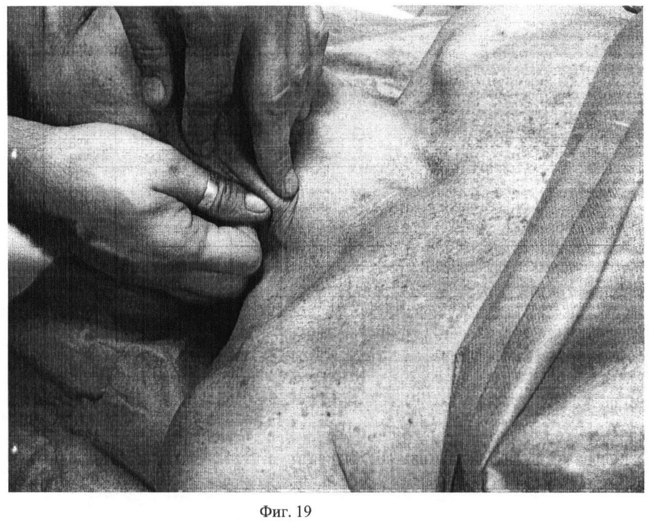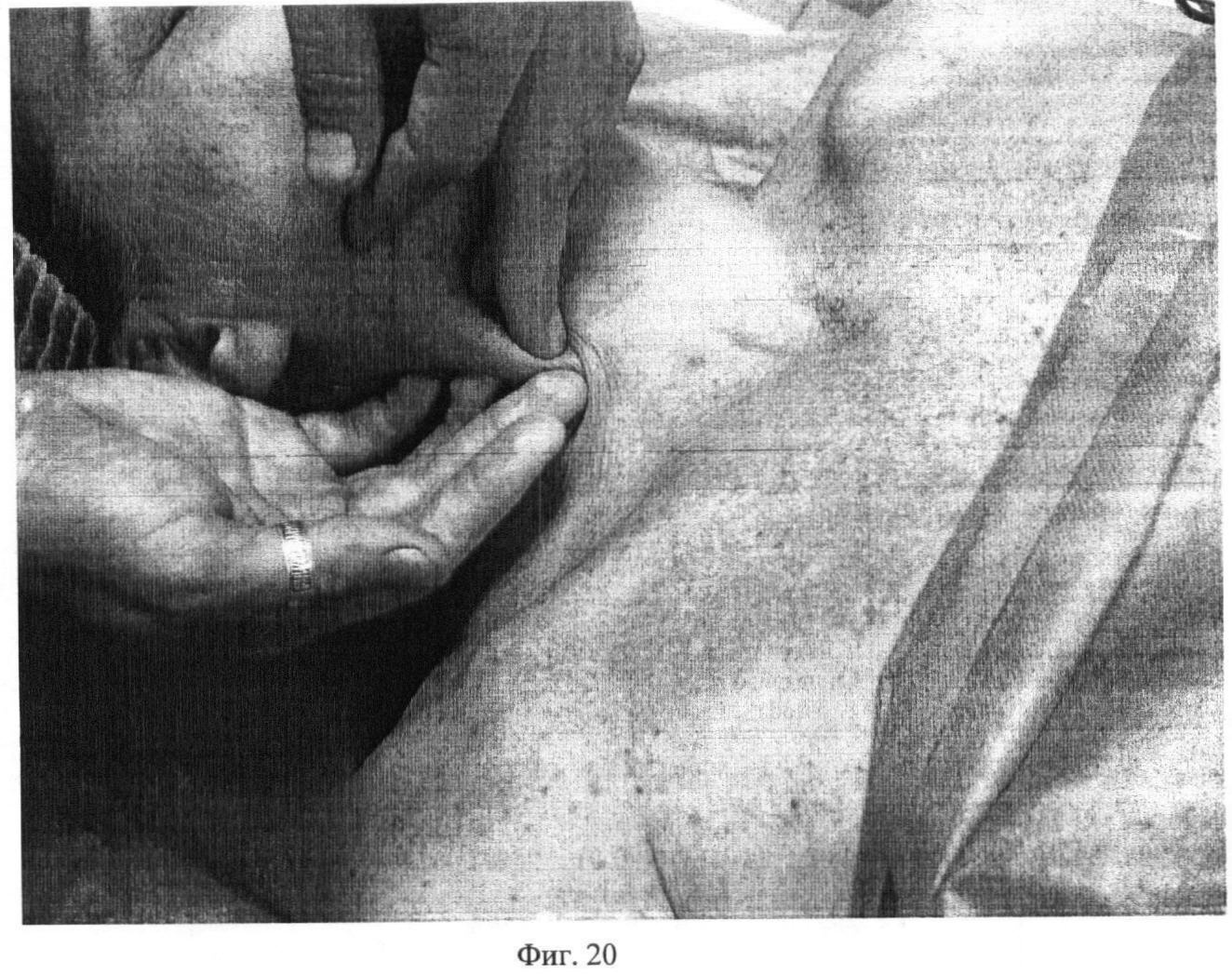 Двенадцатый этап. Фиг.18-19-20. Первым, вторым, третьим и четвертым пальцами обеих рук выполняют сдвигание кожной складки на platisma в различных направлениях, постоянно меняя угол наклона пальцев к массируемой поверхности. Движение выполняют в течение 15 секунд.