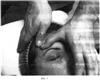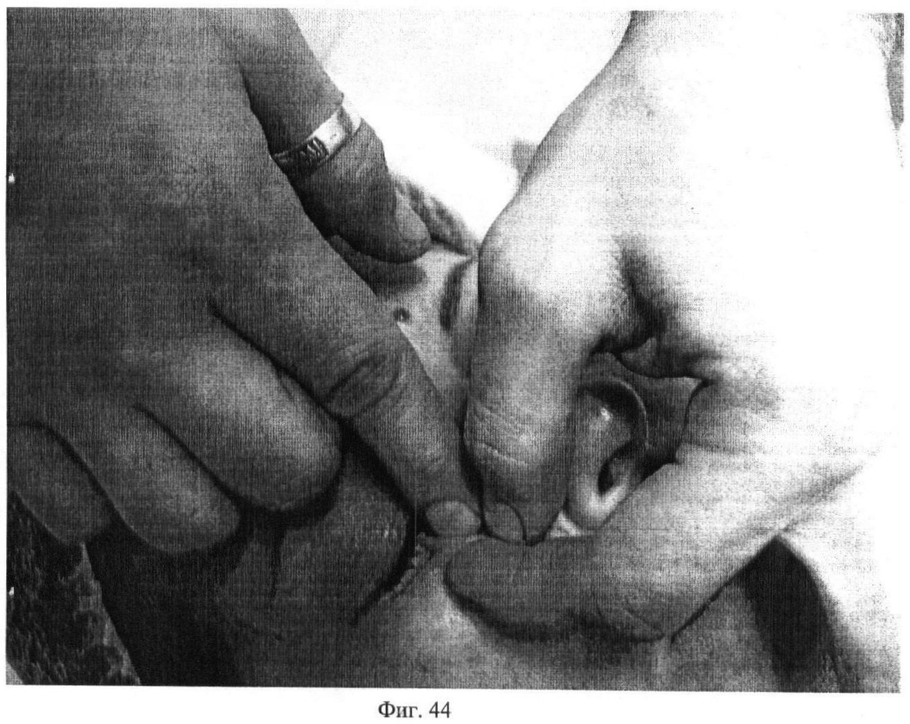 Двадцать седьмой этап. Фиг.43-44. Захватив кожную складку на palpebra inferior между первым и вторым пальцами одной руки, выполняют штрихующие движения вторым пальцем другой руки в различных направлениях, по 15 секунд с каждой стороны.