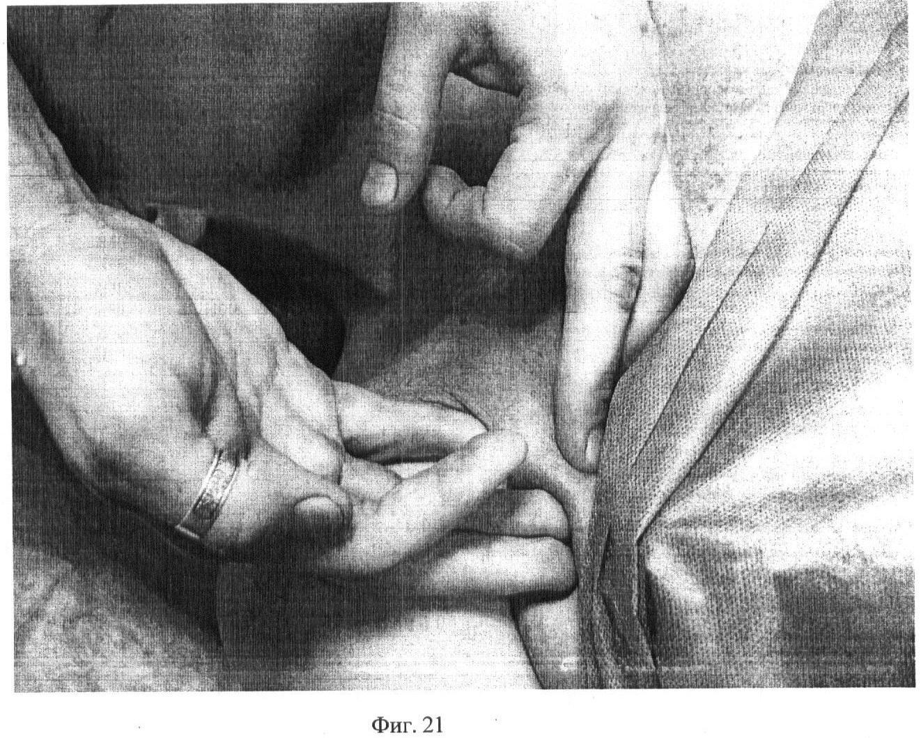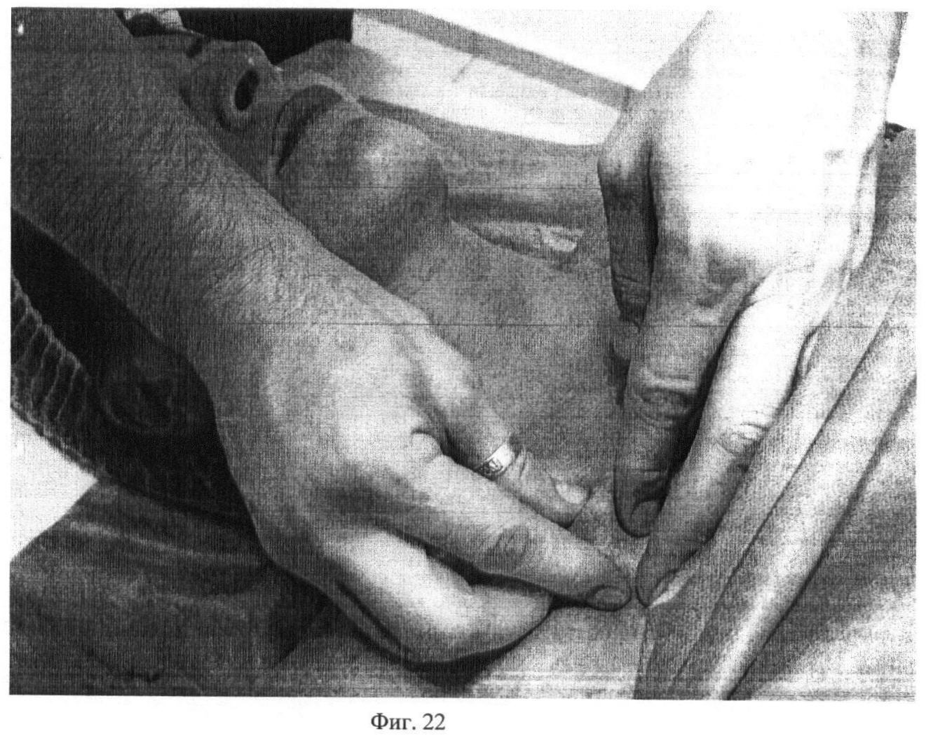 Тринадцатый этап. Фиг.21-22. Придерживая третьим, четвертым и пятым пальцами одной руки валик из массируемой ткани, третьим и четвертым пальцами другой руки выполняют частые накатывающие движения на всей поверхности m. pectiralis major, в течение 15 секунд.