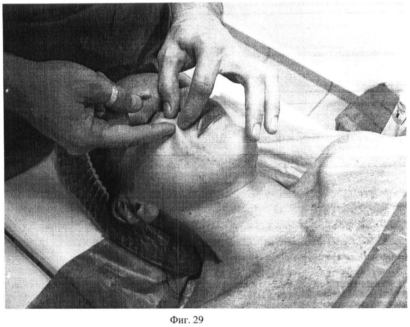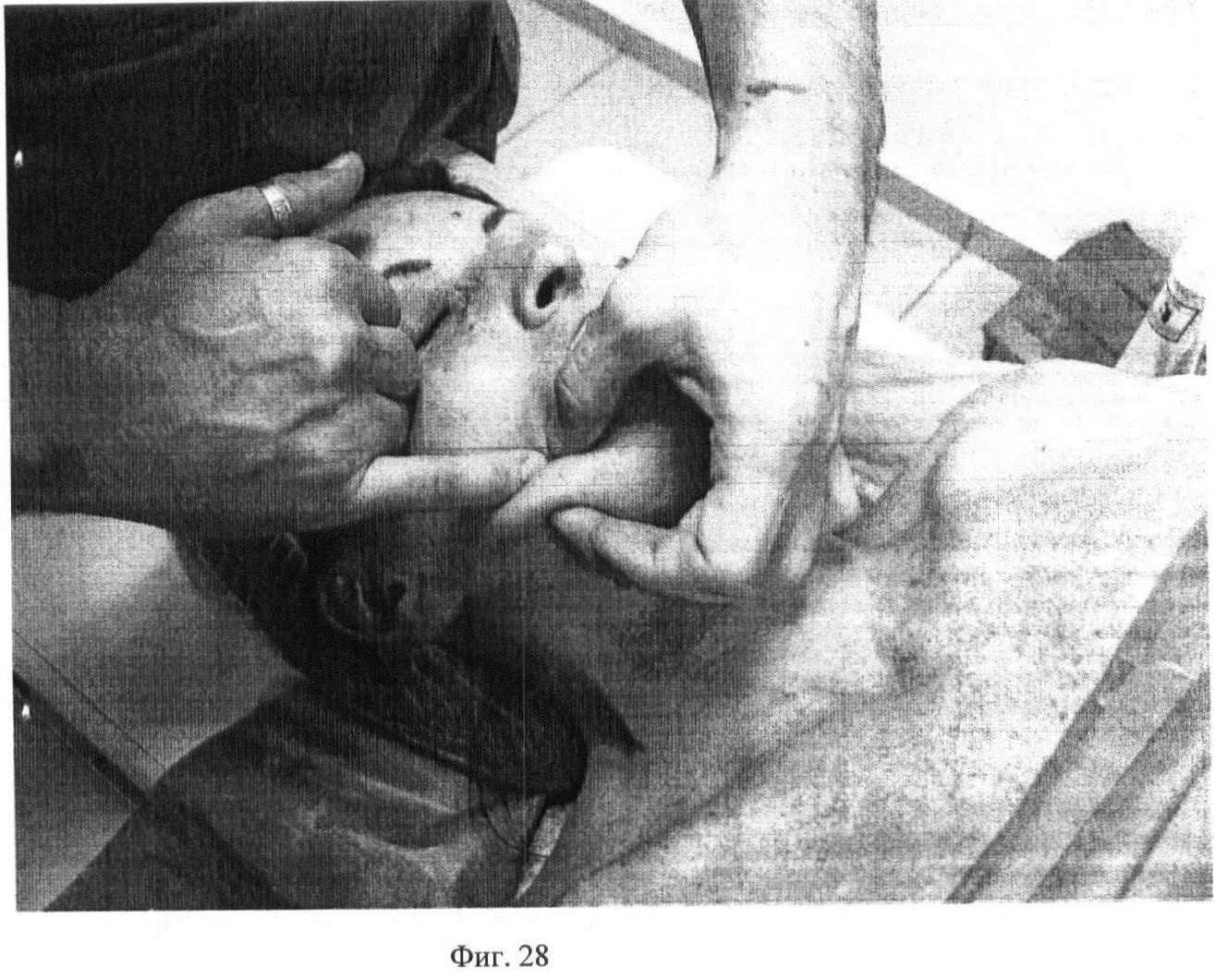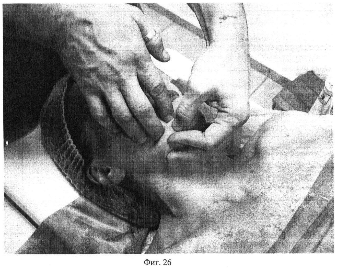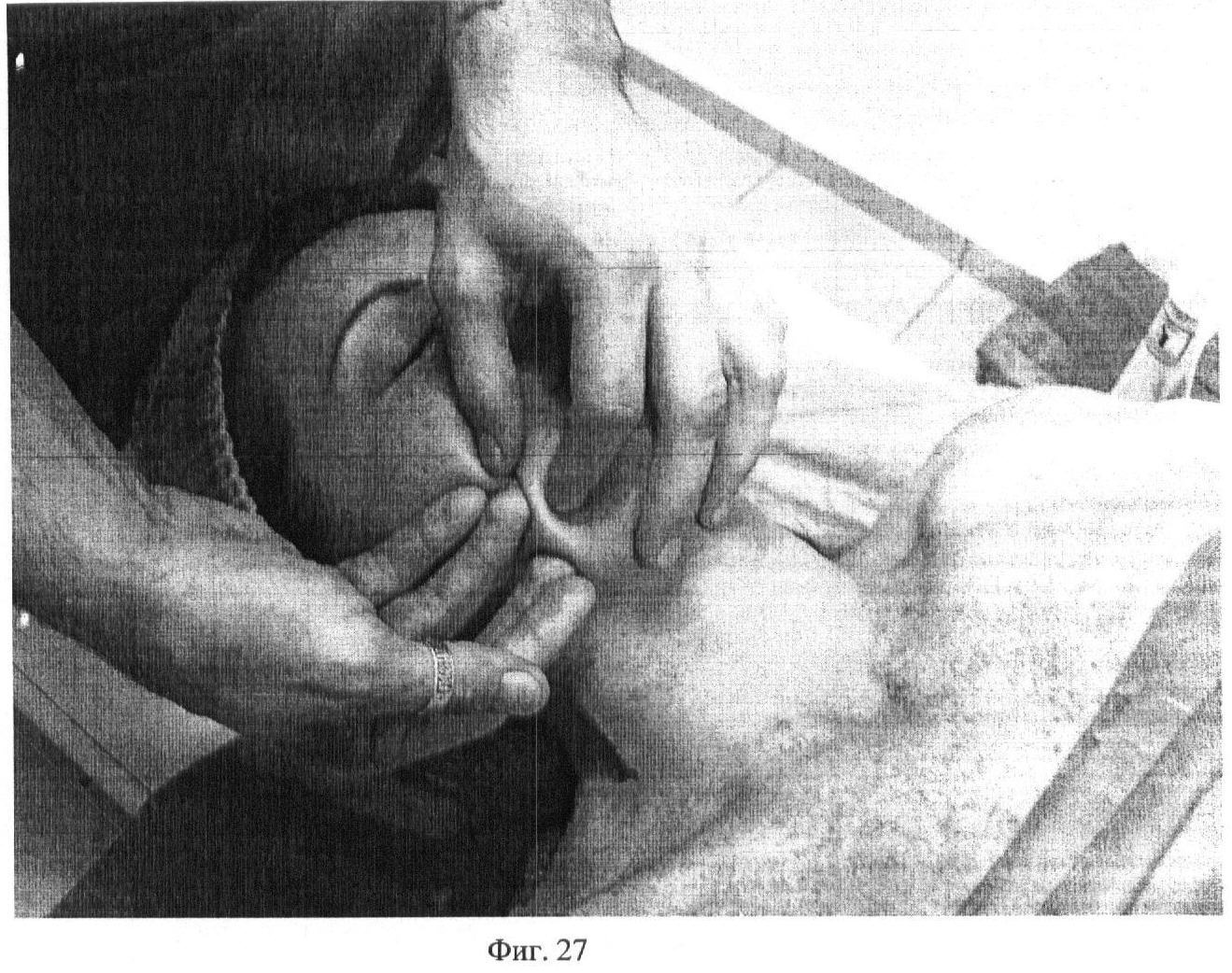 Пятнадцатый этап. Фиг.26-27. Производят глубокое разминание первым, вторым, третьим и четвертым пальцами m. masseter в различных направлениях. Движения пальцев постоянно следуют навстречу друг другу. Прием выполняют 3 раза по 5 секунд с каждой стороны.