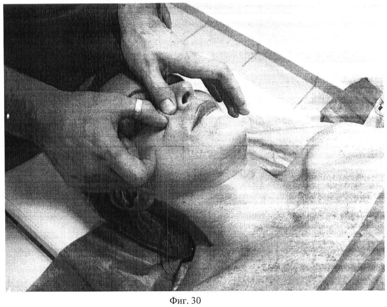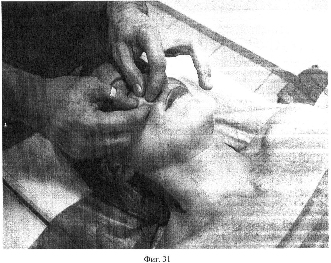 Семнадцатый этап. Фиг.30-31. Проводят плавные круговые разминания regio infraorbitalis, regio zygomatica и regio buccalis вначале первыми пальцами обеих рук, а через 10 секунд первыми и вторыми пальцами, еще 5 секунд.