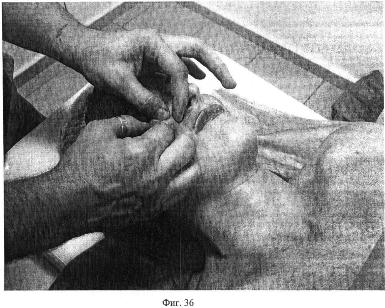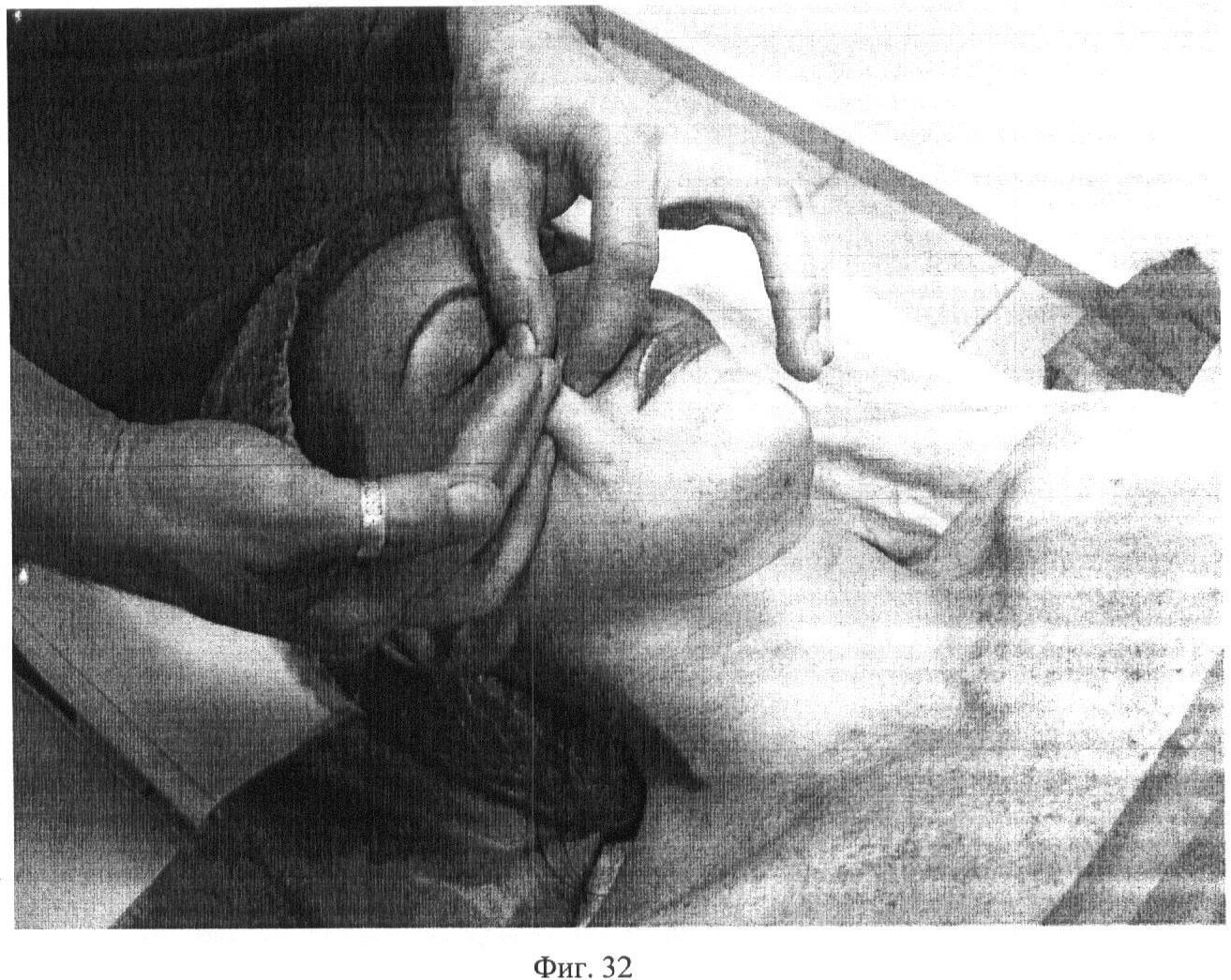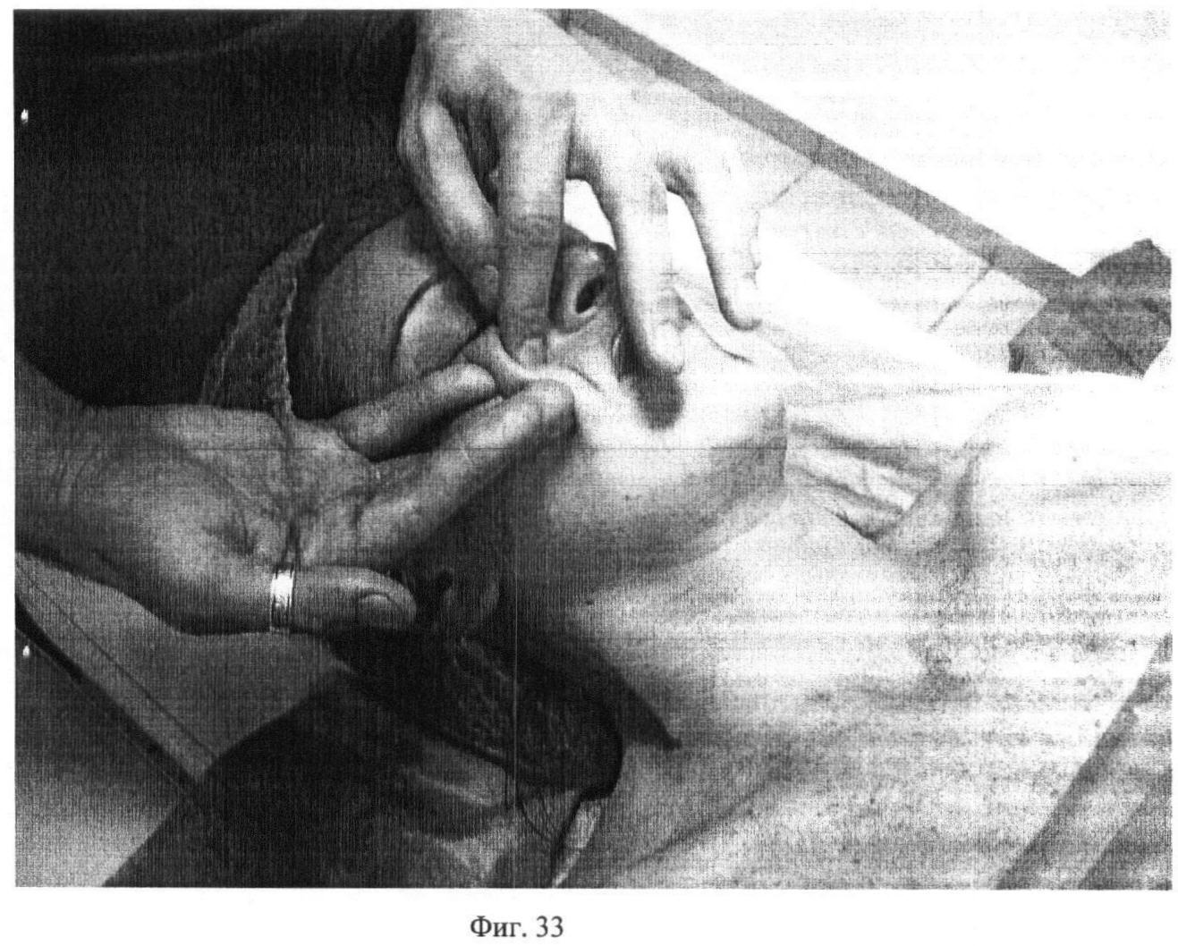 Восемнадцатый этап. Фиг.32-33. Проводят одновременное продольное первым и вторым пальцами одной руки и поперечное третьим и четвертым пальцами другой руки разминание regio infraorbitalis, regio zygomatica и regio buccalis в течение 15 секунд с каждой стороны.