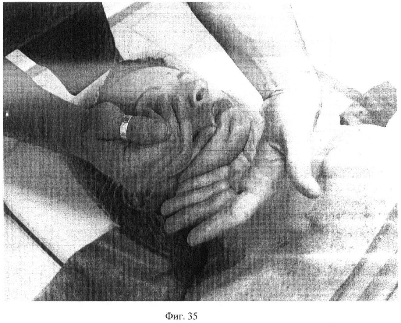 Девятнадцатый этап. Фиг.34-35. Придерживая одной рукой кожную складку на regio buccalis и regio parotideomasseterica (околоушной жевательной области), другой рукой выполняют плавное закручивающее движение по 5 раз с каждой стороны.