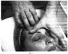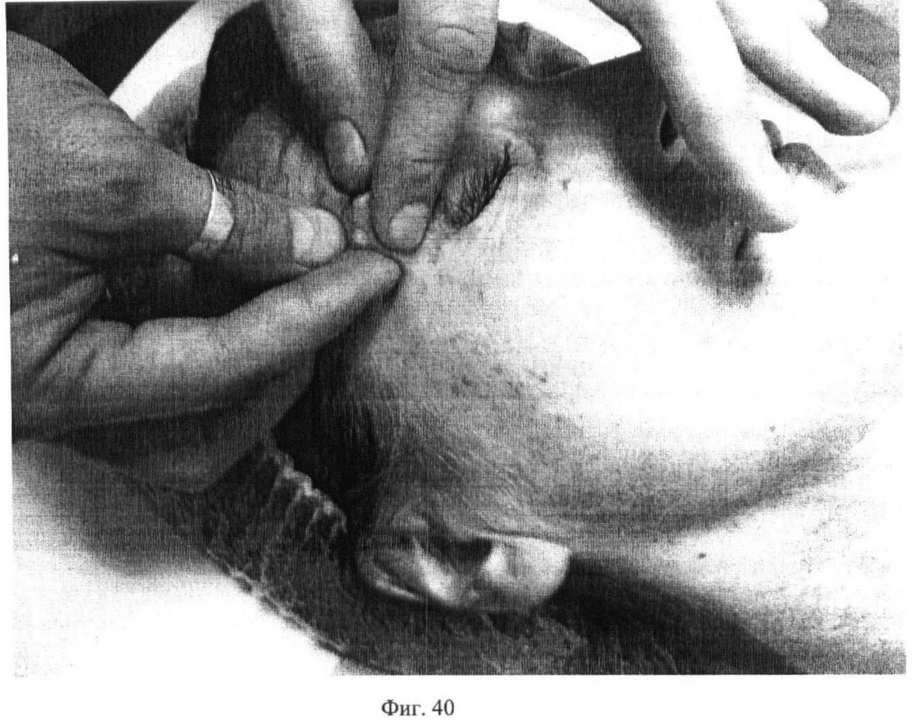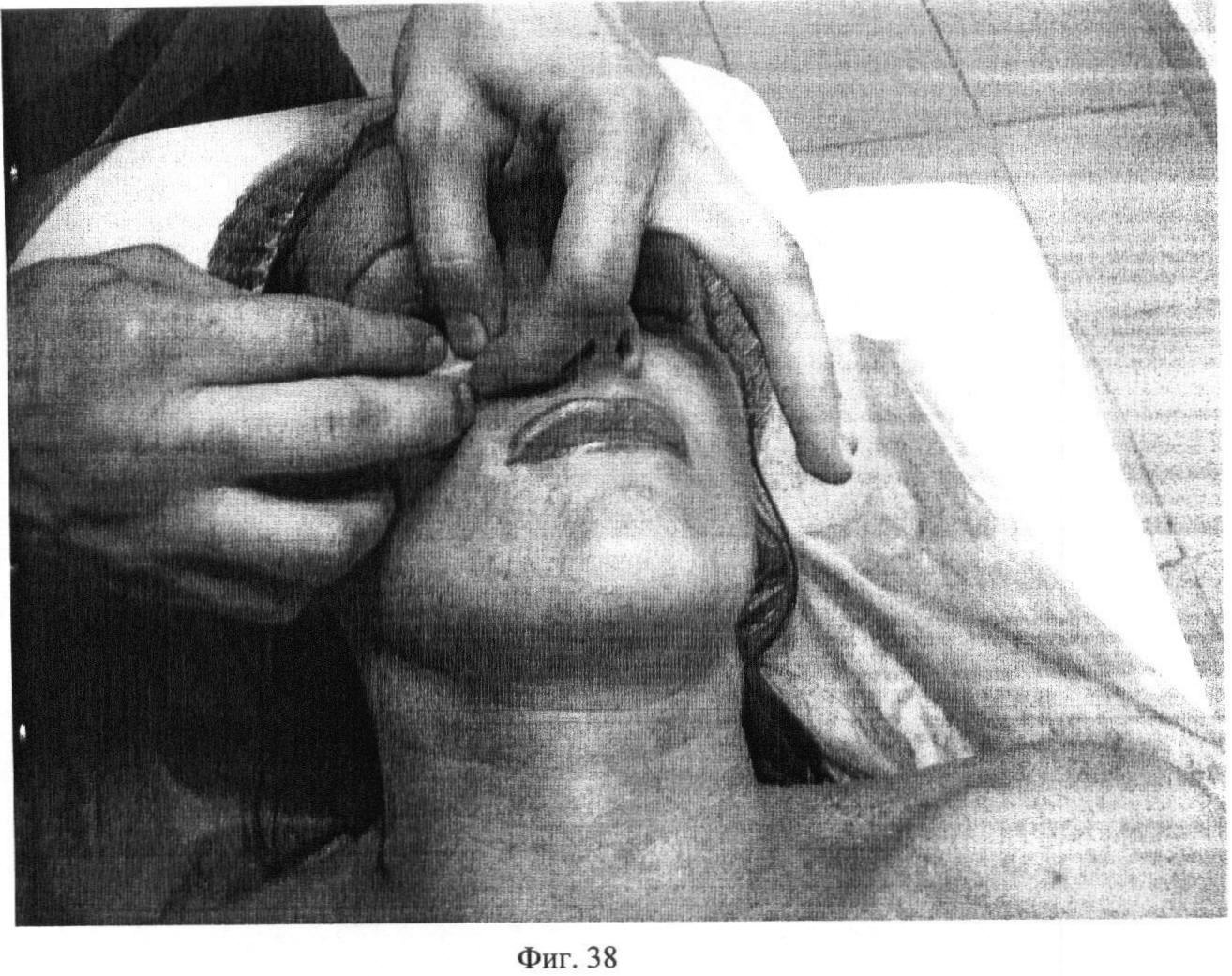 Двадцать второй этап. Фиг.38. Придерживая первым и вторым пальцами одной руки кожную складку на regio zygomatica, вторым и третьим пальцами выполняют сотрясение этой складки, 4 раза по 5 секунд с каждой стороны.