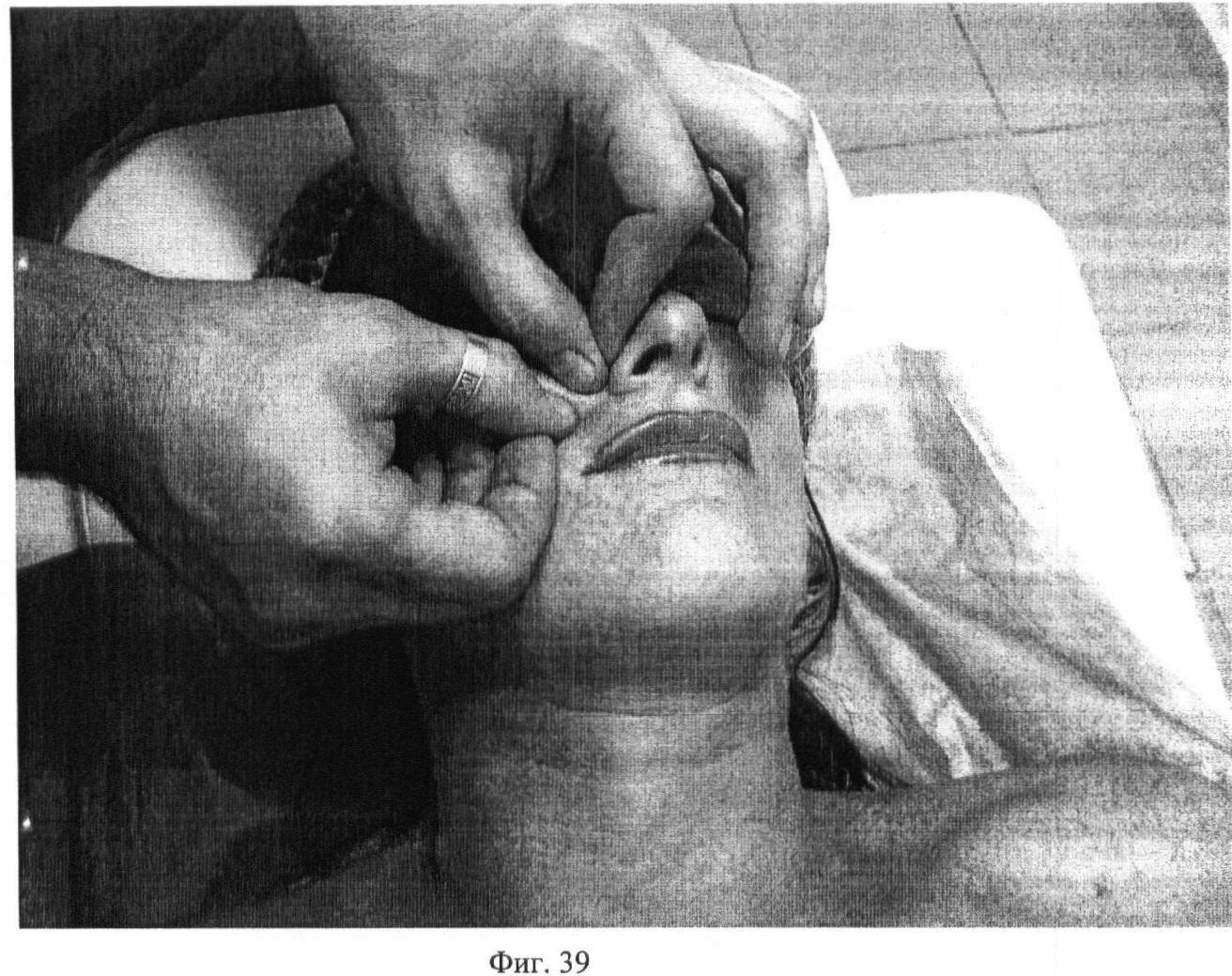 Двадцать третий этап. Фиг.39. Захватив кожную складку на regio buccalis первыми пальцами обеих рук, перемещают ее поступательными движениями сверху вниз, два раза по 10 секунд с каждой стороны.