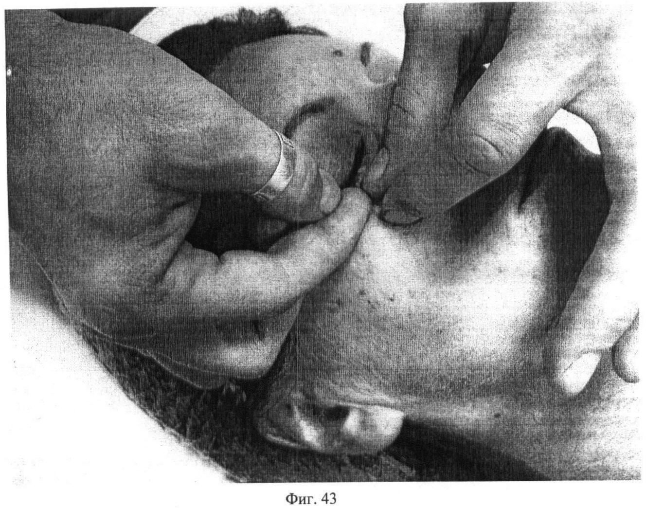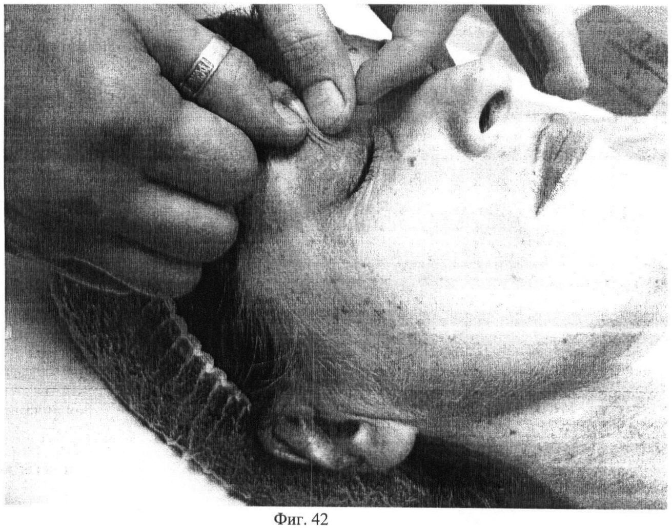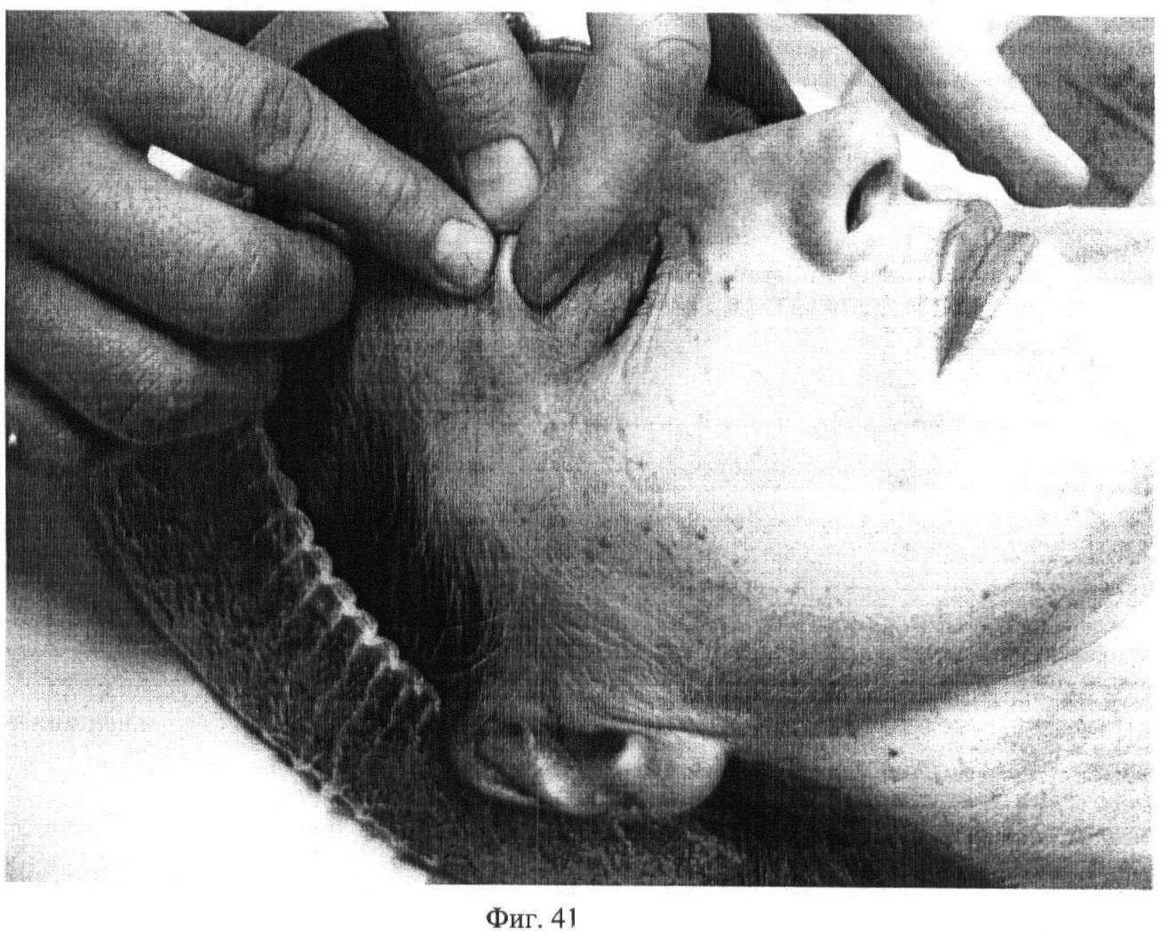 Двадцать пятый этап. Фиг.41. Проводят частое точечное надавливание вторыми пальцами обеих рук на palpebra superior, по 15 секунд с каждой стороны.