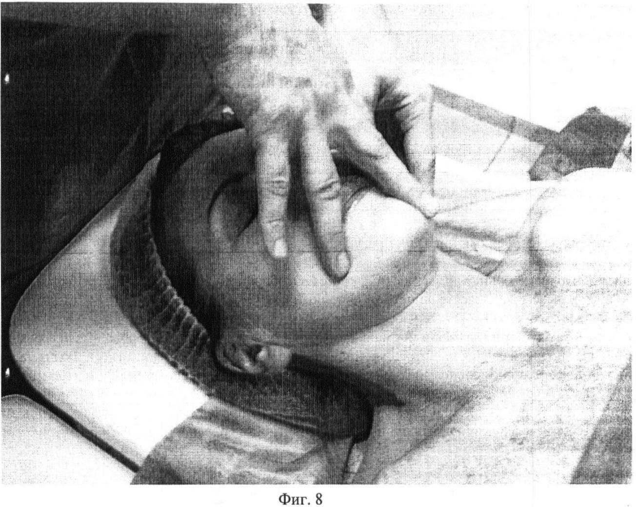 Шестой этап. Фиг.7-8. Вторым и третьим (третьим и четвертым) пальцами выполняют сотрясение в области подбородка, которая включает m. depressor anquli oris, m. depressor labii inferioris, m. mentalis в различных направлениях, в течение 10 секунд.